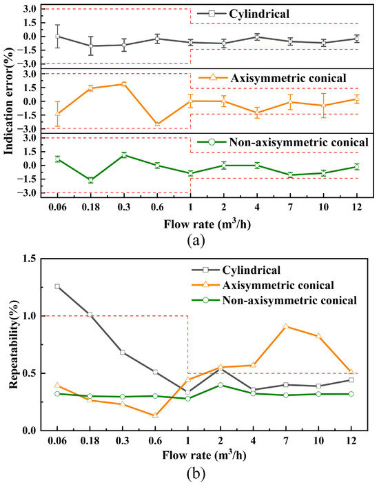 The post-calibration indication error analysis shown in Figure 16a demonstrates significant performance advantages of the non-axisymmetric conical cavity USFM across different flow rate intervals. In flow rate ranges where q < qt, the measurement error remains within ±2.0%, which is better than that of the axisymmetric conical cavity USFM. For q ≥ qt, the non-axisymmetric configuration maintains an error limit of ±1.5%, whereas the axisymmetric conical cavity USFM exceeds the standard allowable range. Figure 16b reveals that the non-axisymmetric conical cavity USFM achieves full-scale repeatability errors below 0.5%, complying with the repeatability specifications for Class 1.5 accuracy instruments. Currently, the axisymmetric conical cavity USFM and the cylindrical cavity USFM cannot meet the same standard.
