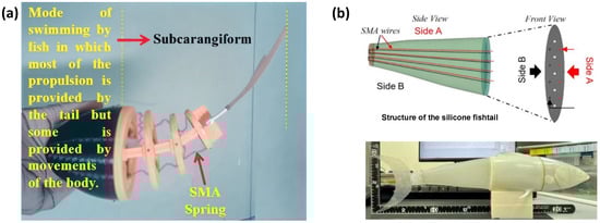 Examples of SBUVs driven by shape memory alloy based soft actuators (SMASAs). (a) Carangiform swimmer based on a SMASA spring mechanism [76]. (b) Wireless soft bionic fish with optimized SMASA parameters [77].