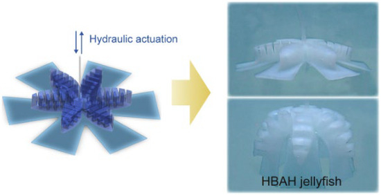 Hydraulic actuation has also been extended to the biomimicry of other aquatic organisms. In 2022, Zhang et al. created a hydraulically driven bio-inspired hydrogel jellyfish (Figure 4), which utilized hydraulic actuation to achieve large deformation while maintaining acoustic transparency, highlighting its potential for adaptive underwater applications [128].