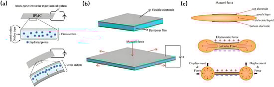 Schematic Diagrams of Three Types of EAPs (a) Schematic Diagram of the Working Principle of Ionic Polymer–Metal Composites (IPMCs) [129]. (b) Schematic Diagram of the Working Principle of Dielectric Elastomers (DEs) [130]. (c) Schematic Diagram of the Working Principle of Hydraulically Amplified Self-Healing Electrostatic (HASEL) Actuators [131].