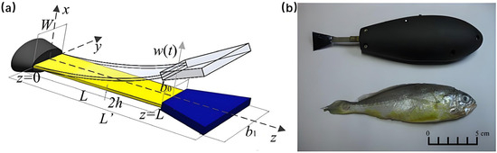 Example of a soft biomimetic underwater vehicle (SBUV) driven by an ionic polymer-metal composite (IPMC) actuator. (a) Modeling diagram of the IPMC caudal fin. (b) Robotic fish comprising a rigid body and an IPMC caudal fin [153].