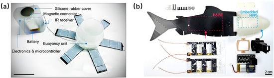 - Katzschmann, R.K.; DelPreto, J.; MacCurdy, R.; Rus, D. Exploration of underwater life with an acoustically controlled soft robotic fish. Sci. Robot. 2018, 3, eaar3449. [Google Scholar] [CrossRef]