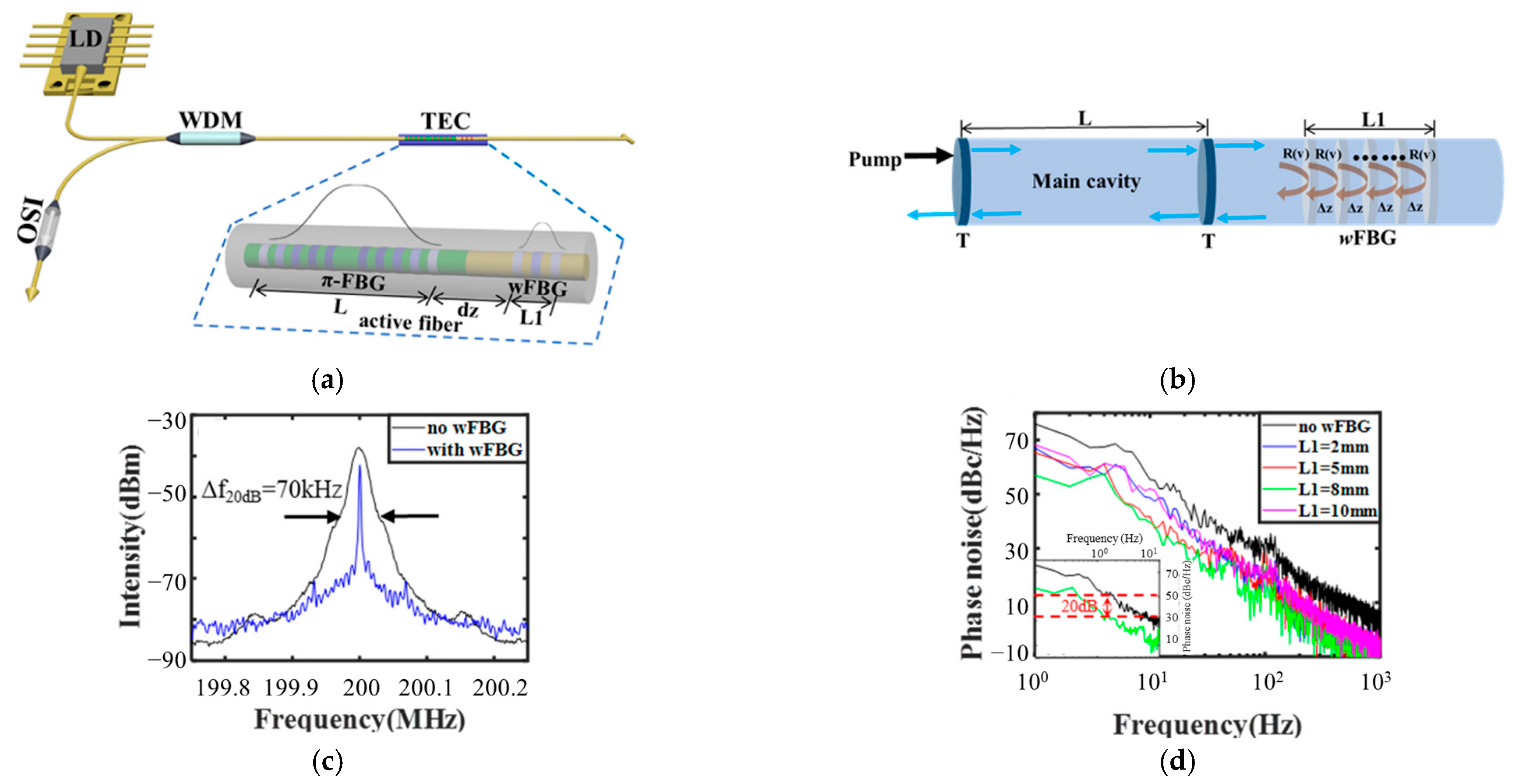 - Zou, M.; Dai, Y.; Xiao, X.; Zhao, W.; Shen, K.; Li, W. Sub-kHz Linewidth Fiber Laser via Weak Fiber Bragg Grating Enabled Self-Injection Locking. IEEE Photonics Technol. Lett. 2024, 36, 1405–1408. [Google Scholar] [CrossRef]