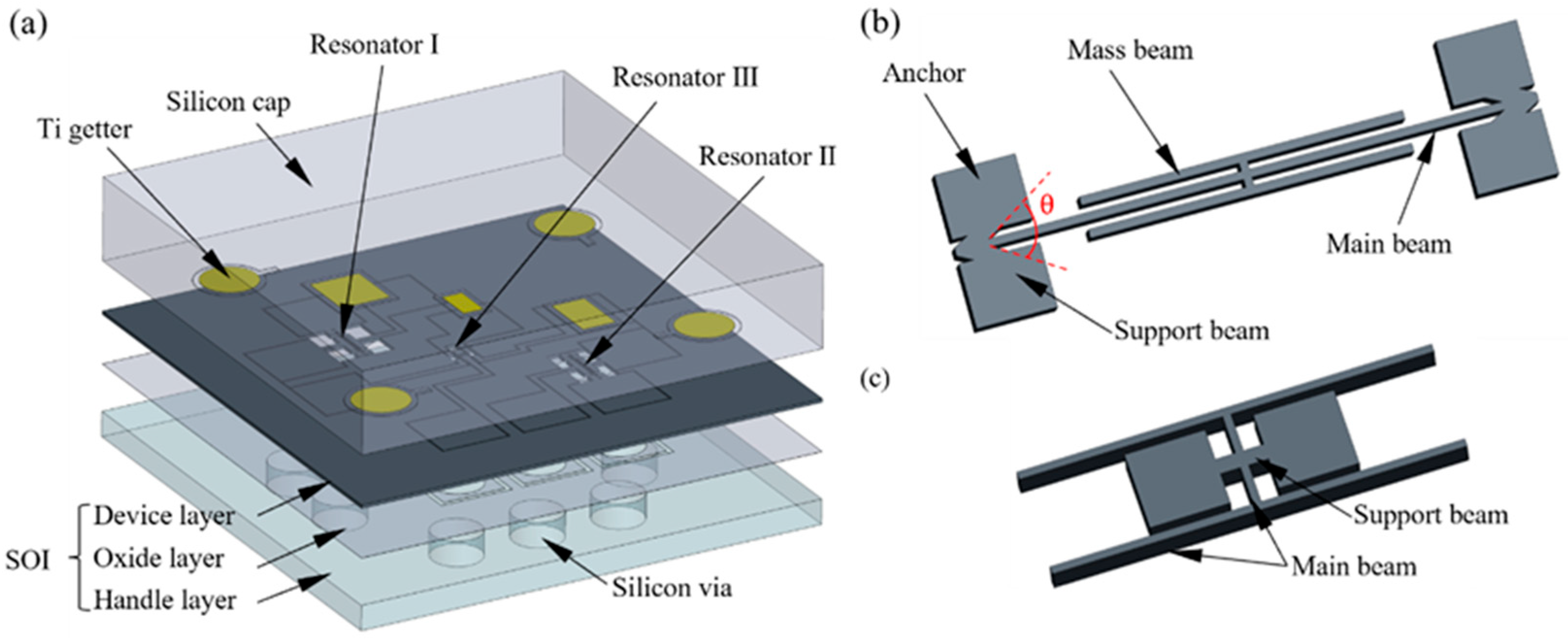 Figure 1a. A silicon wafer serves as the cap layer, while a silicon-on-insulator (SOI) wafer is used to fabricate the device and handle layers. The resonant beams are located in the device layer of the SOI wafer and form suspended structures after releasing the buried oxide layer. To meet high-temperature measurement requirements, electrostatic excitation and capacitive detection are adopted, with corresponding electrodes distributed within the device layer. Getter materials are placed in the resonator and getter chambers on the silicon cap to achieve high-vacuum packaging. The sensor incorporates three resonant beams, each positioned on diaphragms of different sizes. The entire handle layer acts as the primary diaphragm, while the diaphragm structures are formed by combining the device layer with the resonator regions of the cap layer. Resonators I and II are pressure-sensitive resonator beams (
