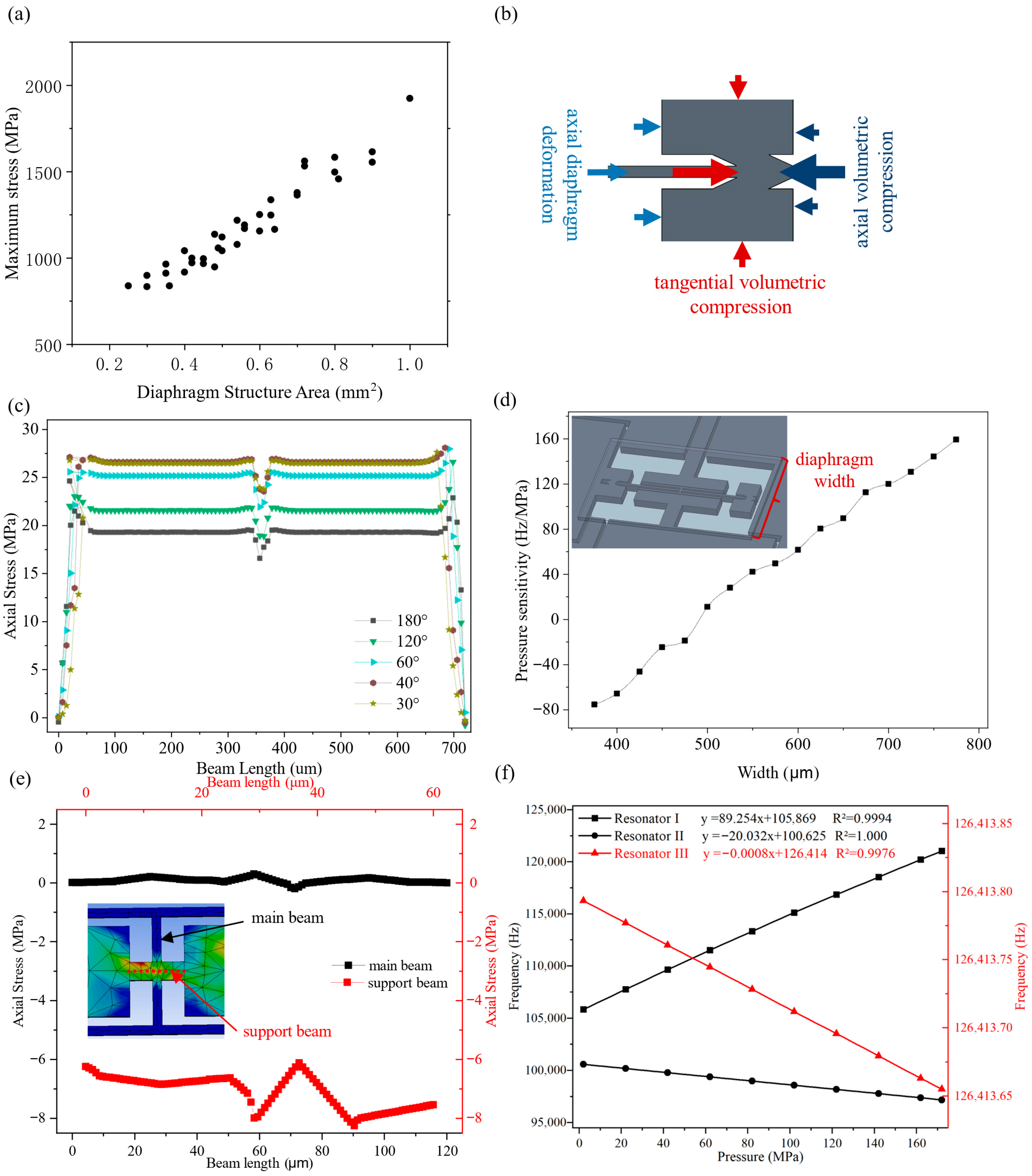 Figure 2b, with the diaphragm width and anchor position fixed as control variables, the variation law of the axial tensile stress of the resonant beams with the angle of the V-shaped support beams was systematically investigated through FEA. As shown in