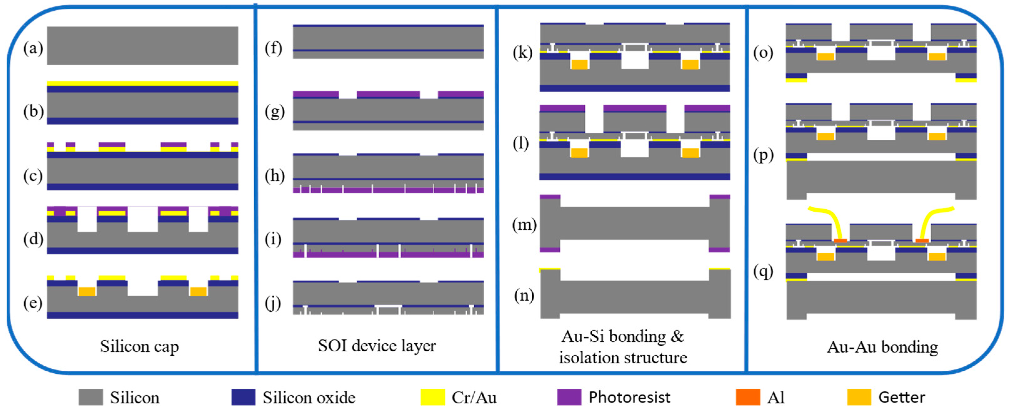 Figure 3j). The SOI device layer was bonded to the silicon cap by Au–Si eutectic bonding using a wafer bonder (SB6e, SUSS, Garching, Germany) at 5000 mbar and 390 °C (