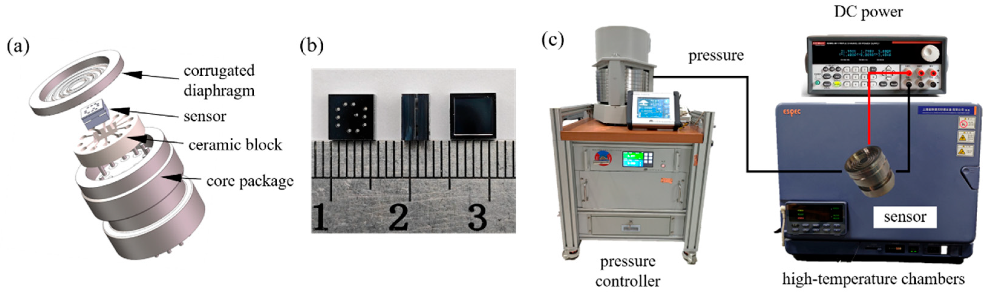 Figure 4b shows the completed sensor chip, which is electrically connected to the packaging pins using gold wire bonding. For high-temperature and high-pressure testing, the sensor chip is packaged in a specialized high-pressure measurement fixture (