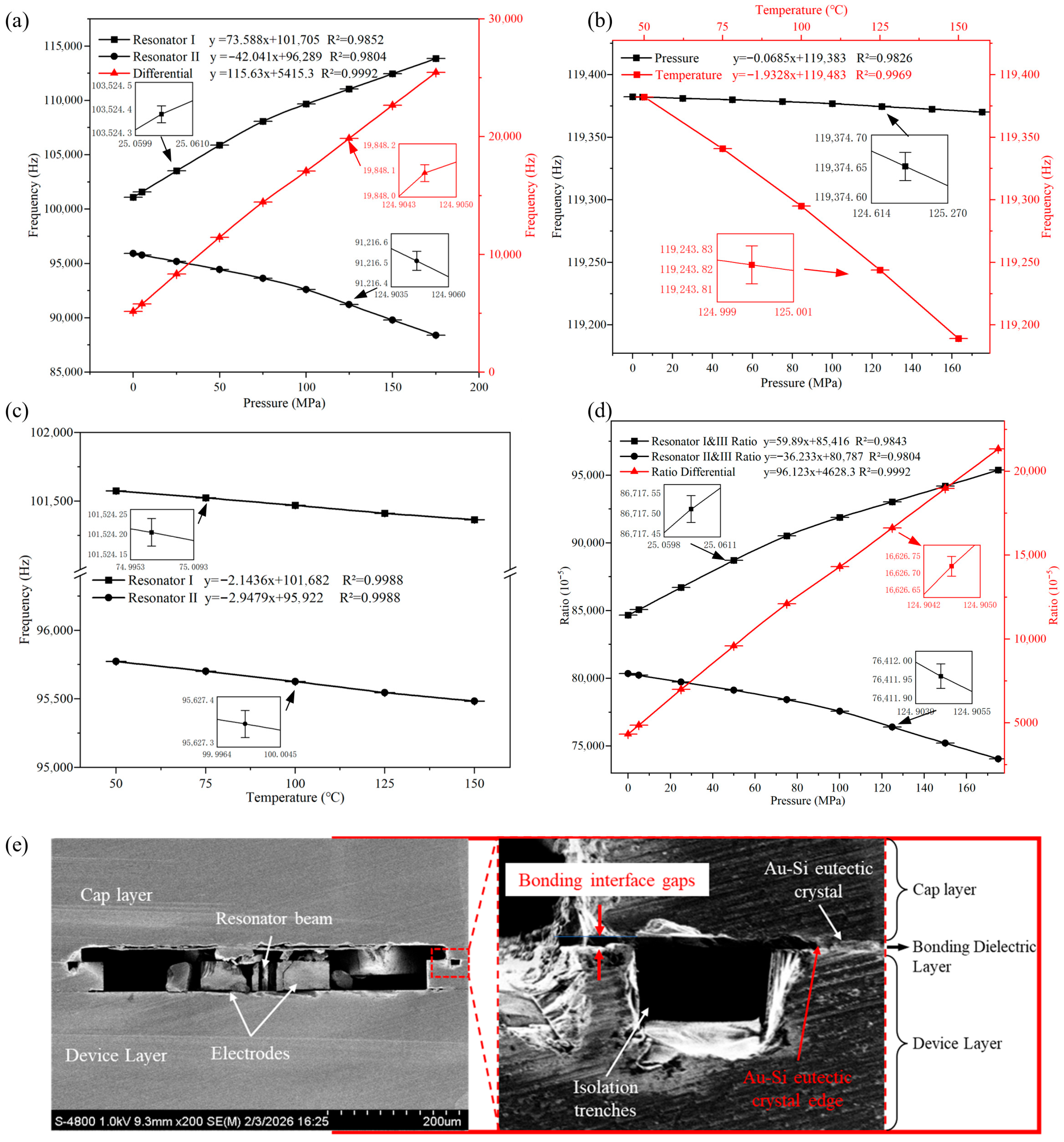 Figure 5e, the Au–Si eutectic crystal edge is at a certain distance from the resonant cavity edge, which results in the presence of gaps between the cap layer and the device layer. When the two surfaces contact each other under high pressure, the dimensions of the membrane structure gradually return to the designed state, and the pressure sensitivities of the resonant beams recover to a matched condition.