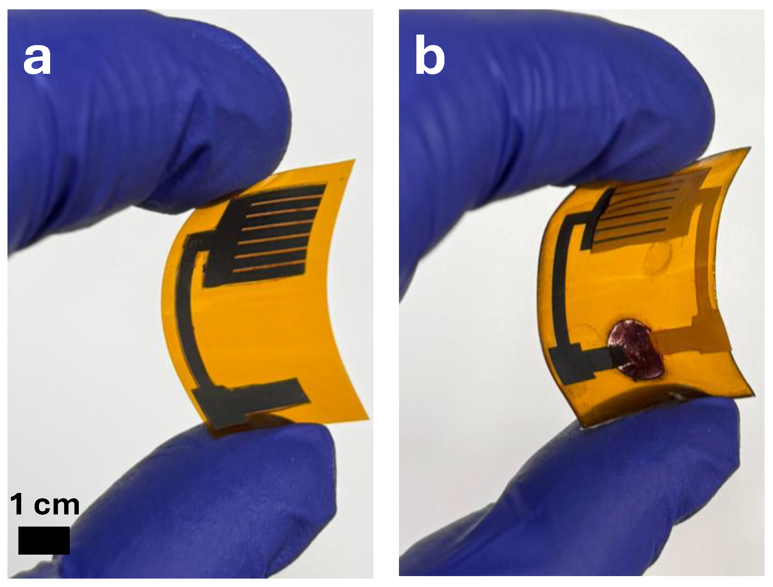 Figure 5a, the laser-patterned interdigitated LIG electrodes are cleanly defined on the flexible Kapton substrate, forming the conductive framework for UV detection. The patterned electrode geometry provides a large active surface area while preserving excellent mechanical flexibility.