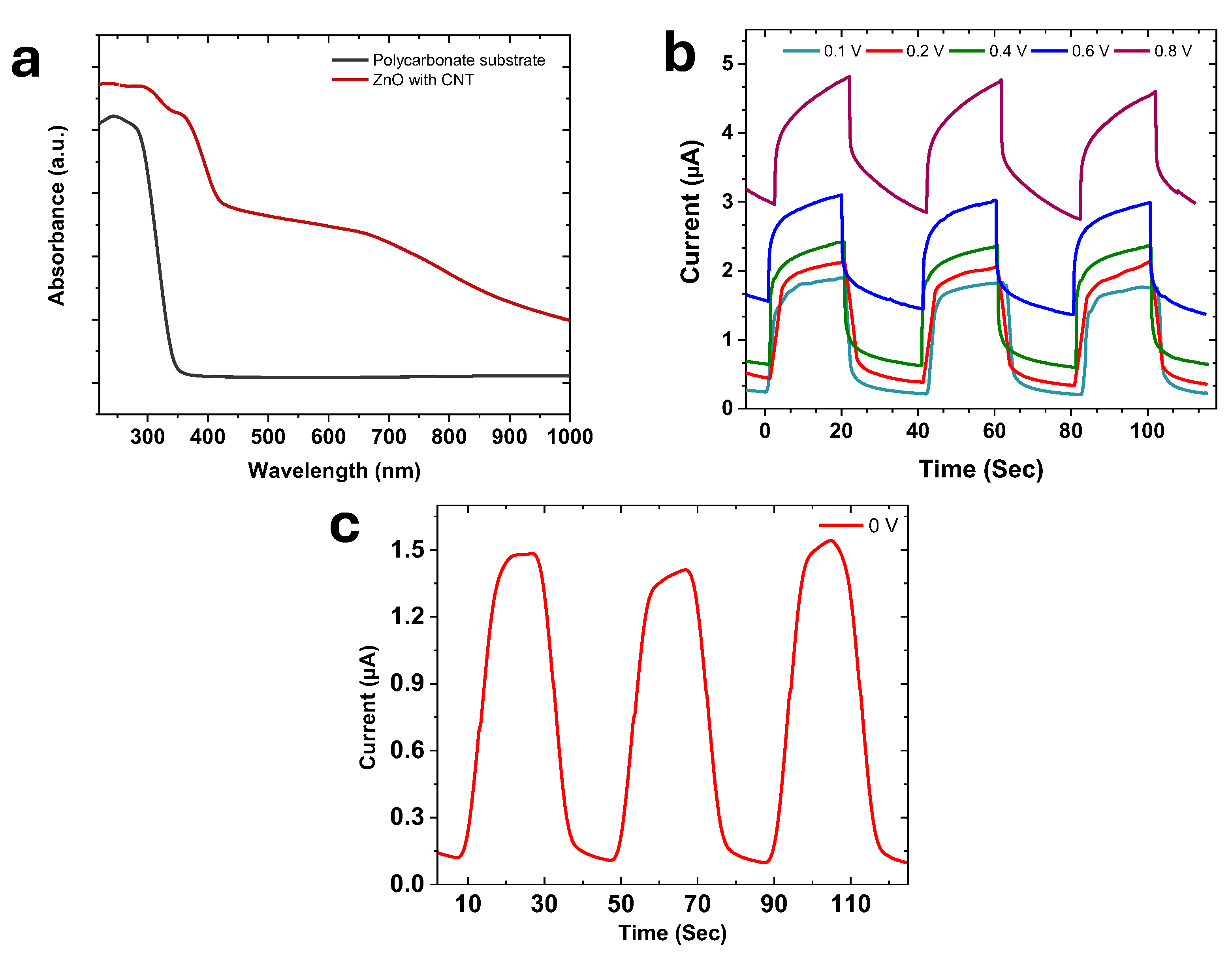 Upon illumination with 365 nm UV light, photons with energy exceeding the ZnO bandgap (3.37 eV) excite electrons from the valence band to the conduction band within the ZnO nanoparticles. The embedded CNTs network facilitates rapid charge separation and transport, enabling efficient collection of photogenerated electrons and holes. This enhancement of current transport pathways is essential for generating the required potential and sustained charge flow to drive ion separation and electrochemical reactions within the coupled ionochromic cell under zero-bias operation. The presence of NaCl electrolyte improves interfacial charge mobility, enabling a measurable photocurrent to form even under zero external bias. The magnitude and duration of this photocurrent scale with the incident UV intensity and exposure time, enabling direct transduction of optical energy into electrical charge.