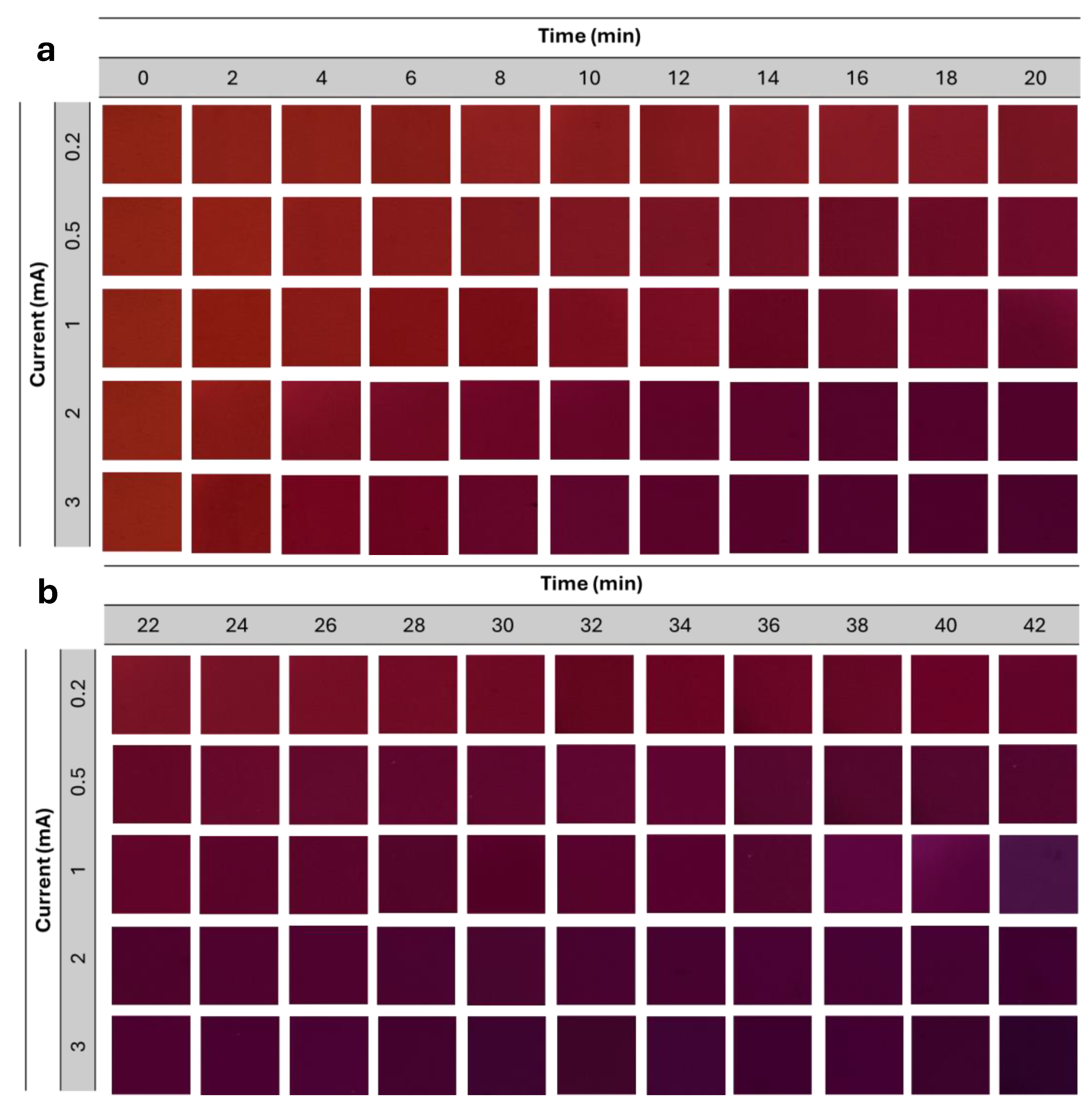 Figure 7 shows the time-dependent color evolution of the ionochromic cell under controlled charge injection at various current levels. At lower injection currents, the color transition proceeds gradually from red to reddish-purple, indicating a slower rate of proton consumption and a more gradual pH shift within the anthocyanin-based electrolyte. In contrast, increasing the applied current significantly accelerates the chromatic response, leading to deeper purple coloration over substantially shorter durations. This behavior is attributed to the higher charge flux delivered to the Sn electrode, which enhances the oxidation reaction and increases the local alkalinity within the ionochromic reservoir.
