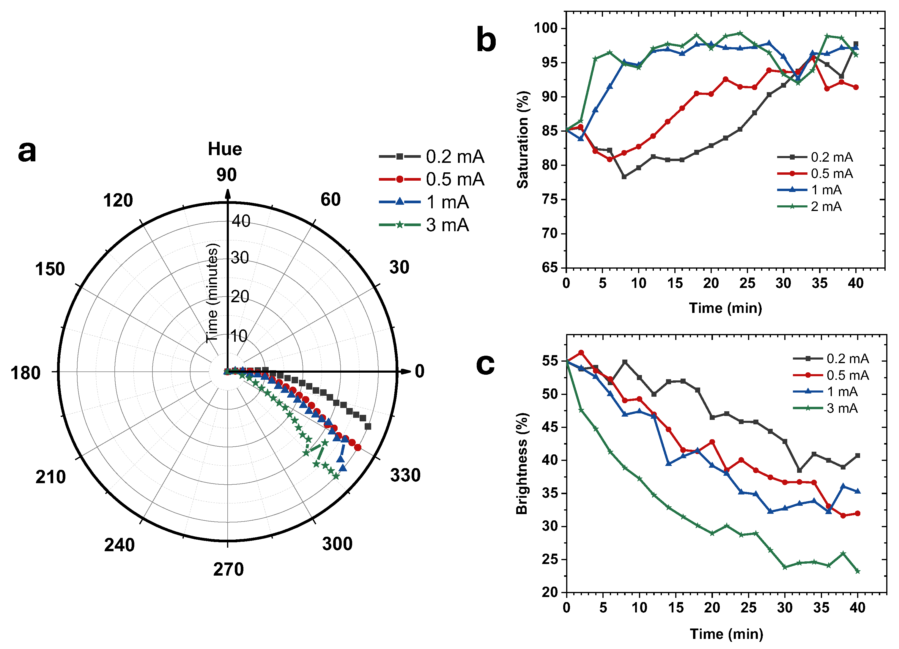 Figure 8a). Higher current levels induce faster hue shifts, indicating accelerated ionochromic kinetics under increased charge flux. In contrast, saturation increases during the color transition, reflecting enhanced chromatic contrast, while brightness decreases due to increased optical density as the electrolyte darkens (