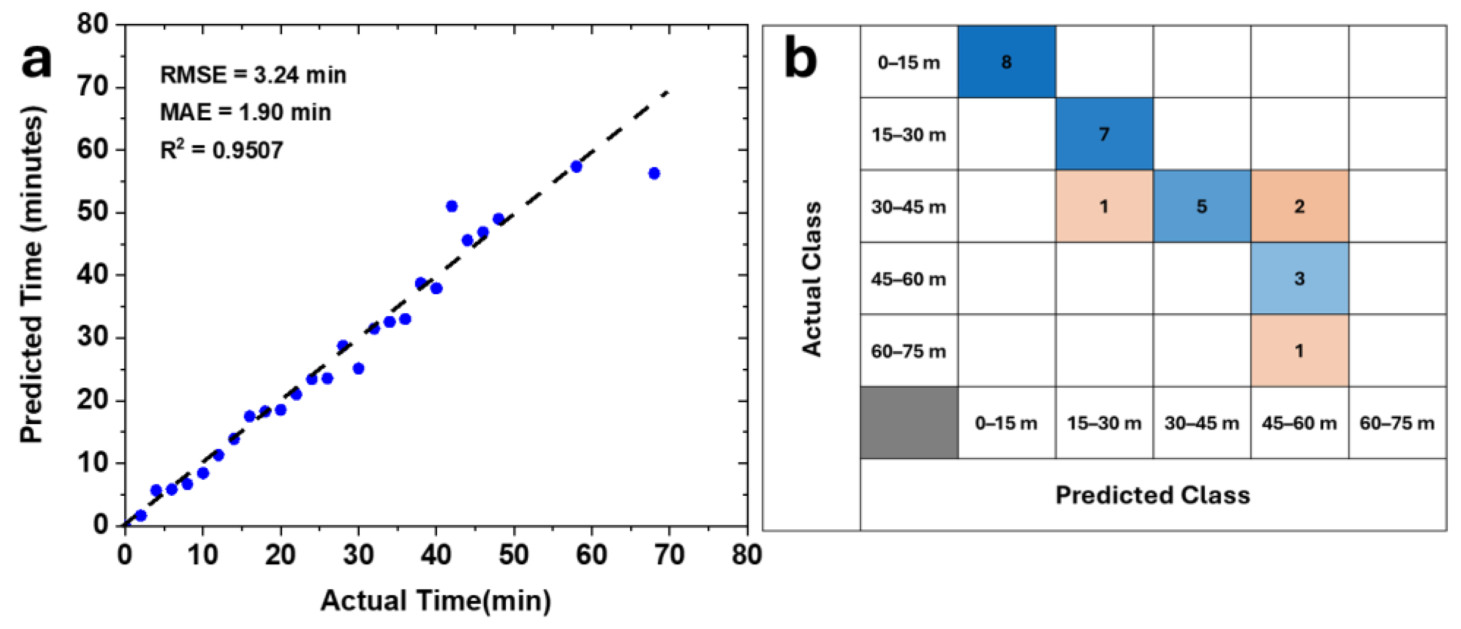 Figure 9a, strong agreement is observed between predicted and actual times across the whole duration range. Quantitatively, the model achieves a root mean square error (RMSE) of 3.24 min and a mean absolute error (MAE) of 1.90 min, indicating high temporal prediction accuracy. The coefficient of determination (R