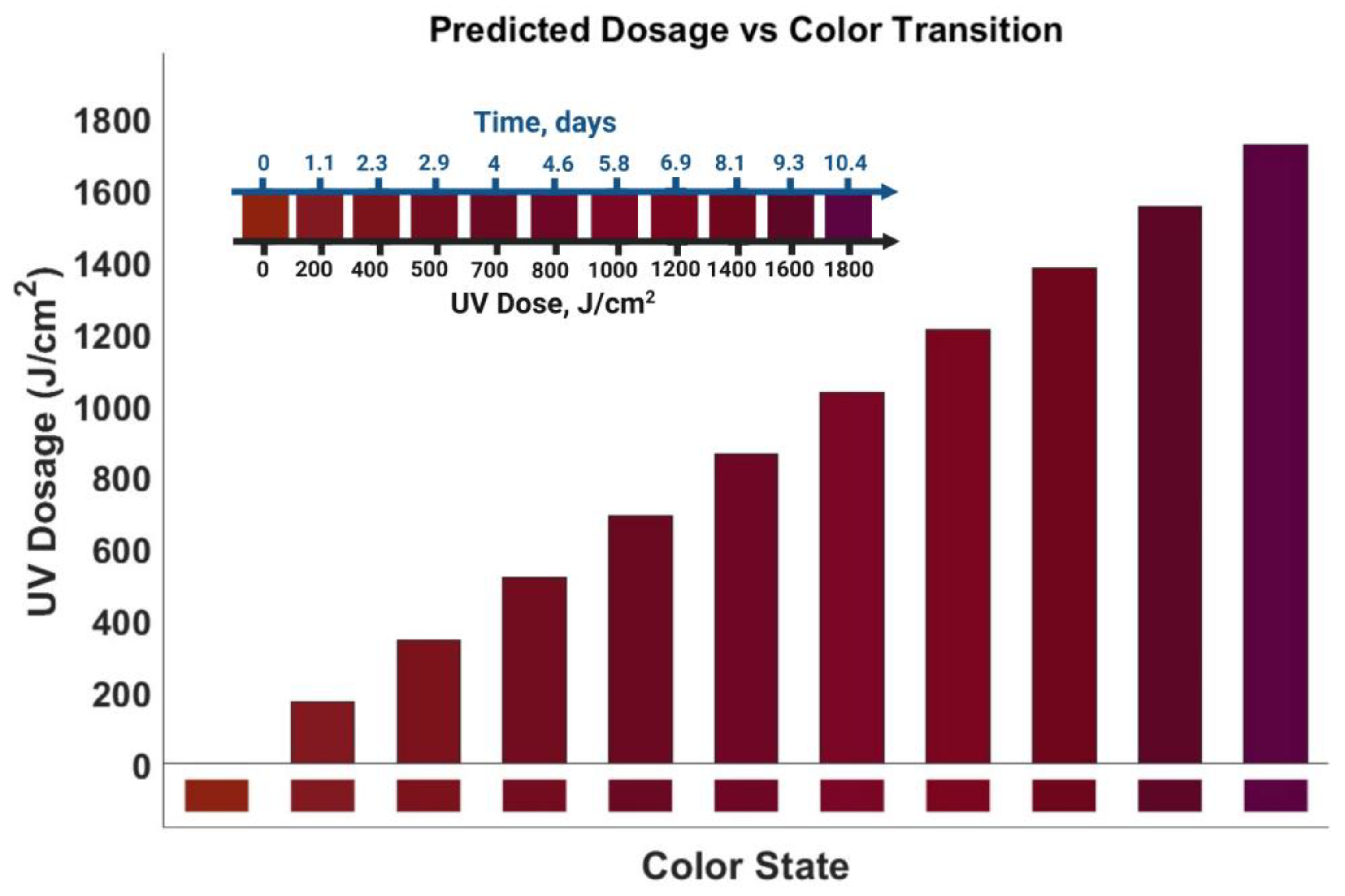Figure 10 presents the dose–color calibration map of the ionochromic UV dose sensor under zero-bias operation, establishing a quantitative relationship between the observed color state and the accumulated UV dose. The calibrated color evolution exhibits a gradual, monotonic transition from the baseline red state to progressively darker purple hues as the accumulated UV dose increases, confirming that the ionochromic response is governed by cumulative exposure rather than instantaneous intensity.