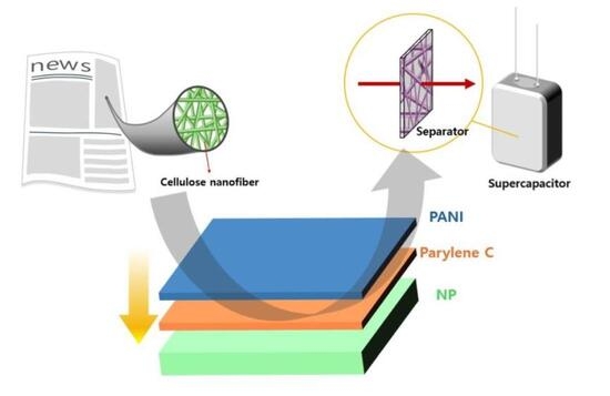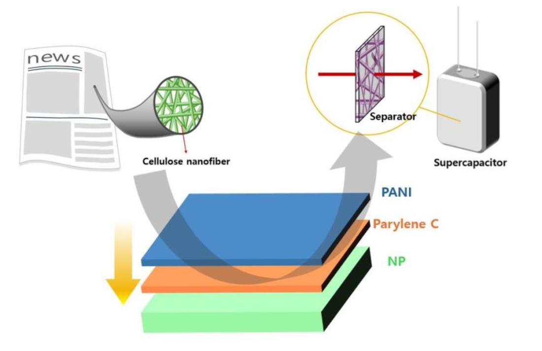 Building on the mechanically reinforced cellulose separator established in the earlier study, this work proposes a multilayer separator architecture that upcycles waste newspaper into an environmentally friendly, high-performance separator for supercapacitors. A Parylene C coating is first applied to the recycled-cellulose scaffold to provide mechanical robustness, dimensional stability, and electronic insulation, and a PANI-based functional polymer layer is subsequently introduced on top of this polymer-coated framework. In this design, the inner cellulose/Parylene C framework maintains the required mechanical strength and electronic insulation, while the outer PANI layer is utilized to improve electrolyte interaction and ionic transport at the separator–electrolyte interface. The objective of this study is to demonstrate that integrating PANI into a recycled-cellulose-based separator enables simultaneous enhancement of the mechanical stability and ion-transport properties of the separator, thereby providing a sustainable and functionally advanced separator platform for high-performance supercapacitors.