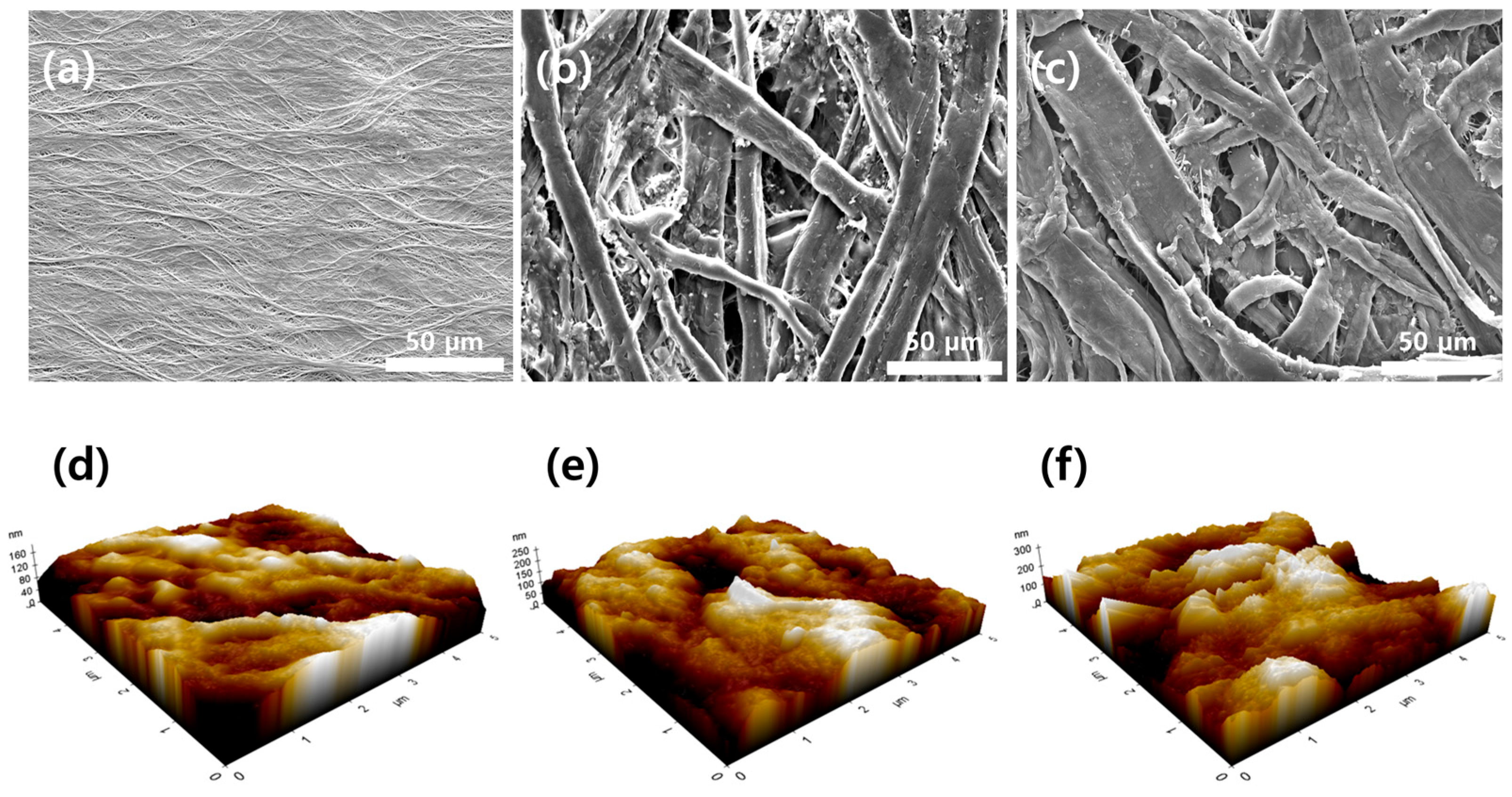 Figure 2e), the surface roughness increased significantly, with an RMS roughness of 41.426 nm. This enhancement is attributed to the uniform deposition of the Parylene C polymer layer, which effectively encapsulated the cellulose fibers, reinforcing the mechanical integrity of the separator. The increased roughness also indicates modified surface topography, which can promote electrolyte retention and interfacial stability. Following the additional PANI coating (PANI@PC@NP) (