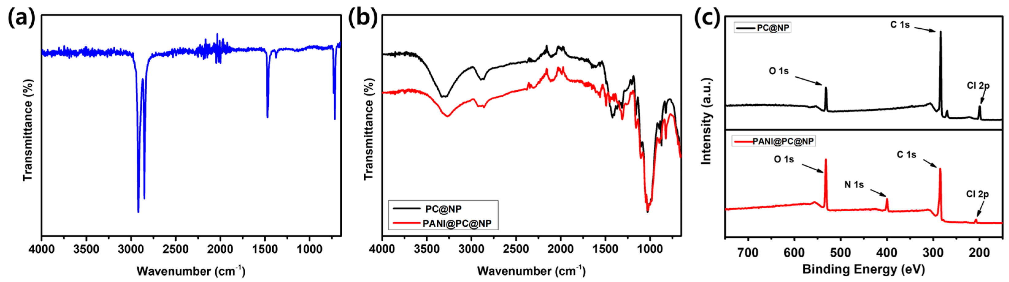 −1, mainly associated with O–H stretching in the cellulose framework, becomes less intense after coating, which can be interpreted as partial coverage of surface hydroxyl groups. With the subsequent PANI coating (PANI@PC@NP), further spectral changes are observed in the 1450–1600 cm
