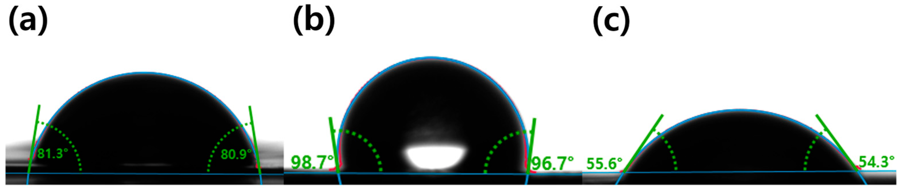 Figure 4c), the contact angle decreased to ~55.98° (