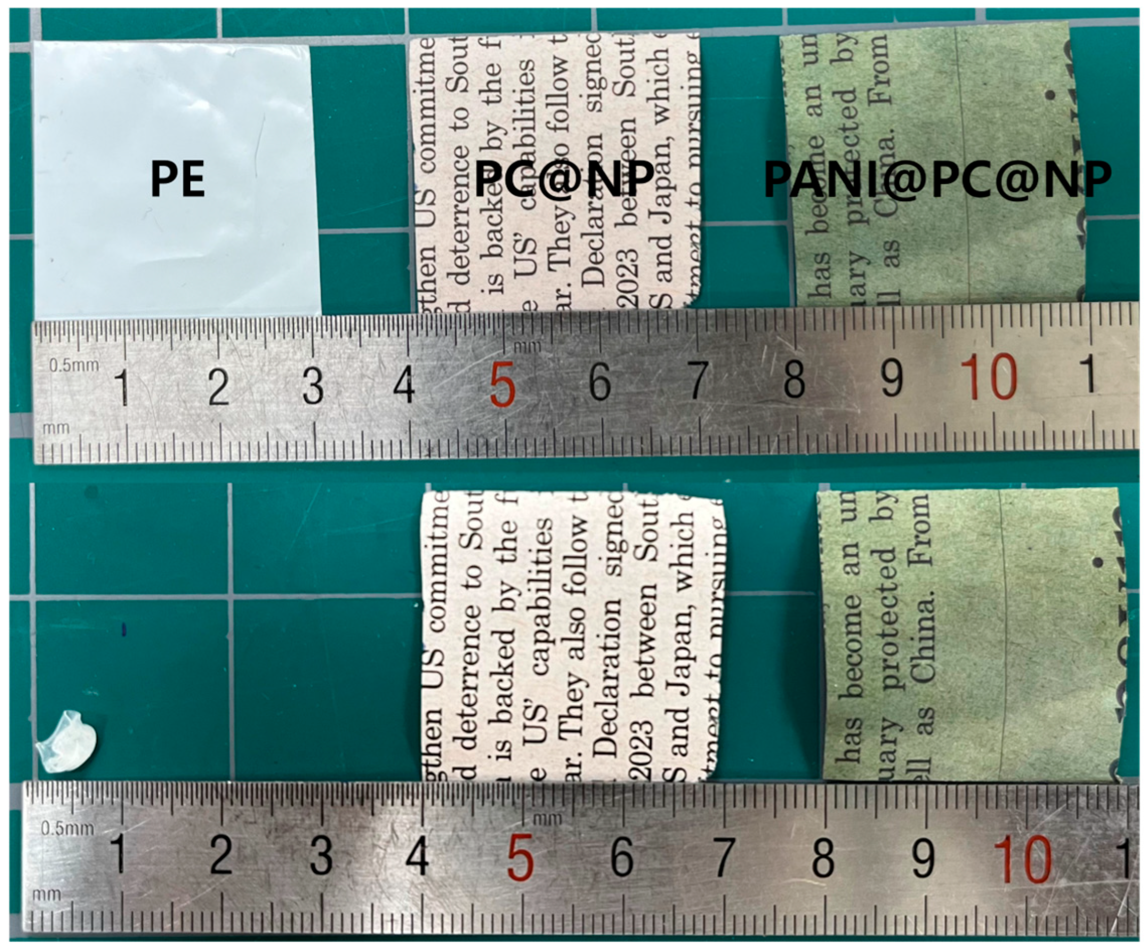 Figure 5, all separators exhibit comparable in-plane dimensions before heating, with an initial side length of approximately 3.0 cm. After the thermal treatment, the PE separator undergoes severe dimensional collapse, and its side length decreases to about 0.6 cm, corresponding to a linear shrinkage ratio of ~80%. In contrast, both PC@NP and PANI@PC@NP maintain their macroscopic dimensions within the resolution of optical inspection, and no measurable shrinkage is detected (