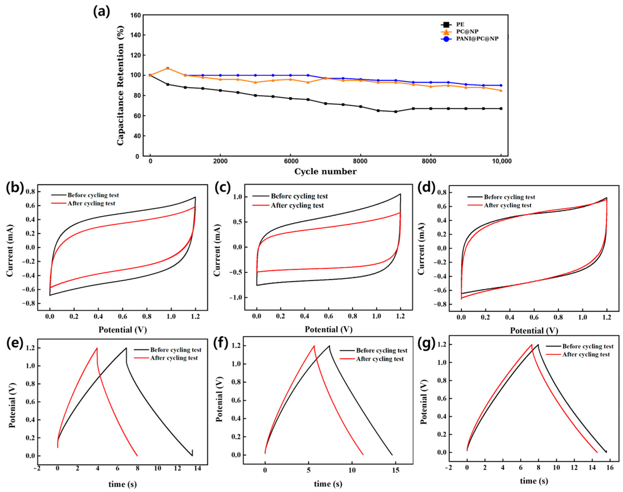 Figure 7e–g). PE exhibits more evident changes in the charge–discharge response after cycling, whereas PC@NP and PANI@PC@NP show relatively minor deviations, indicating better retention of electrochemical behavior. Overall, the cycling results (