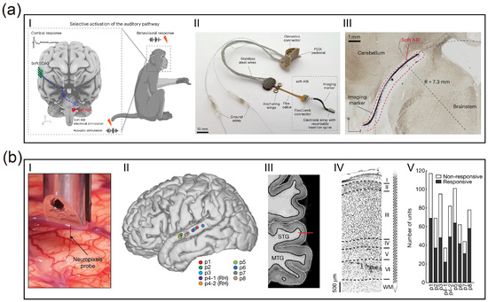 Advanced materials and biomimetic designs for auditory neural interfaces. (a) Validation of a soft ABI in non-human primates [33]. (I–II) Schematic of the closed-loop “brainstem stimulation–cortical recording” paradigm and photograph of the device featuring a resorbable spine. (III) Histological cross-section after 17 months of chronic implantation, demonstrating intimate conformal contact with the curved brainstem surface and long-term structural stability. (Creative Commons Attribution 4.0 International License). (b) High-resolution laminar recording in human auditory cortex using Neuropixels probes [68]. (I–IV) Intraoperative localization and histological verification of probe insertion in the Superior Temporal Gyrus (STG). (V) Distribution of speech-responsive single neurons across cortical layers, highlighting high-yield decoding capabilities. (Creative Commons Attribution 4.0 International License).