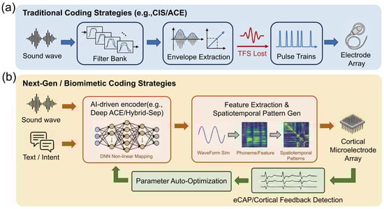Paradigm shift in neural coding strategies for auditory prostheses: From linear envelope extraction to closed-loop biomimetic computation. (a) Traditional open-loop coding strategies (e.g., CIS/ACE). The acoustic input is processed through a linear filter bank, where only the temporal envelopes are extracted from varying frequency channels, resulting in the loss of temporal fine structure (TFS) information (indicated by the dashed internal waveforms). The final output consists of fixed, equidistant electrical pulse trains delivered uni-directionally to a standard cochlear implant electrode array. (b) Next-generation closed-loop biomimetic strategies. Multimodal inputs, combining acoustic signals with semantic intent signals (e.g., via brain–computer interfaces), are fed into an AI processing core (e.g., deep neural networks) for non-linear mapping. Instead of simple pulse trains, the system generates complex spatiotemporal activation patterns, depicted as a heatmap grid, which are written onto a high-density cortical microelectrode array. A crucial feedback loop utilizes physiological signals, such as electrically evoked compound action potentials (eCAPs) or auditory evoked potentials (AEPs), to enable real-time parameter auto-optimization, forming a bidirectional adaptive system.