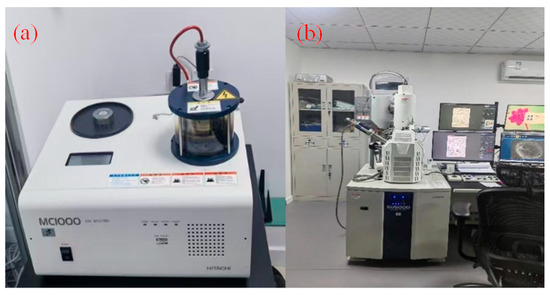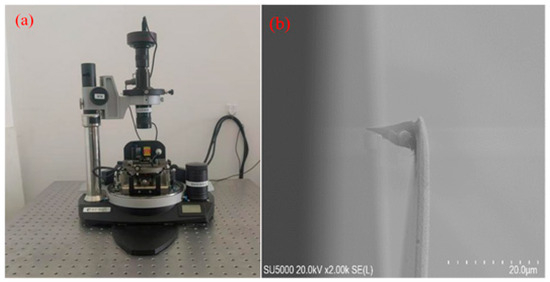 To improve the reliability of wear data, four independent manual scribings were conducted under the same conditions. After each test, the worn probe tips were inspected with a field-emission scanning electron microscope (FE-SEM, Su5000, Hitachi High-Tech Corporation, Tokyo, Japan). Before imaging, all probes were coated with a thin layer of gold using a sputter coater (MC1000, Hitachi High-Tech Corporation, Tokyo, Japan) for its accurate measurement. The facilities used are shown in Figure 2.