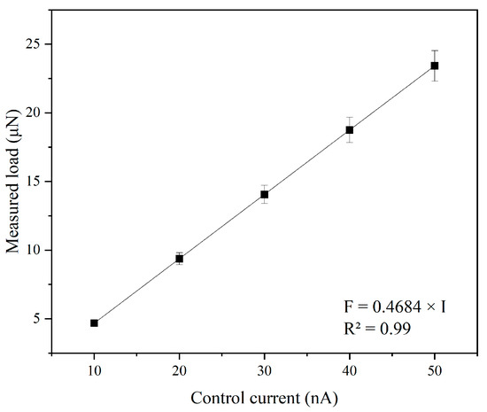 To establish a quantitative relationship between the electrical control parameters and the mechanical response of the diamond probe during nanoscratching, calibration was performed prior to the experiments. In this system, when applying a control current to the tip, its corresponding reaction force can be obtained through Equation (1) as follows: