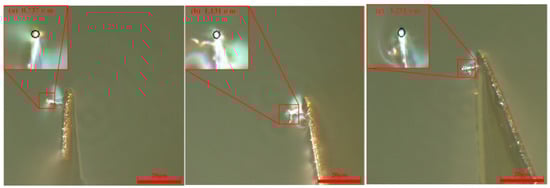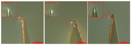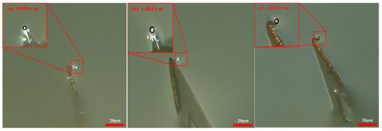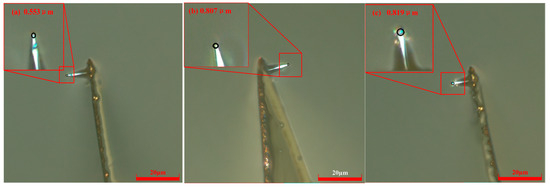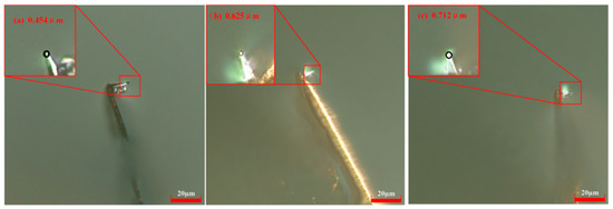 When the scribing speed was 52.5 μm/s and the control current was 15 nA, the probe radius gradually increased with scribing distance. Using the same scribing speed of 52.5 μm/s and a control current of 20 nA, the measured probe radii were 0.553 μm at a scribing distance of 60 μm, 0.807 μm at 180 μm, and 0.819 μm at 300 μm. The digital microscope images are shown in Figure 11.