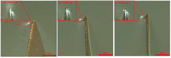 In order to verify the accuracy of the probe tip radius measurement by digital optical microscope, Figure 16 presents the representative micrograph results of probe tips after scribing over a fixed distance of 300 μm under V = 5 μm/s, H = 50 nA and V = 100 μm/s, H = 50 nA, respectively. It can be seen that the measurement results under conditions of V = 5 μm/s and 100 μm/s with the same current levels 50 nA are 0.992 μm and 1.41 μm. Compared with the results measured by digital optical microscope, the errors are within 7.2%, where it can be considered that the measurement data is basically accurate and reliable, taking into account the influence of human measurement factors.