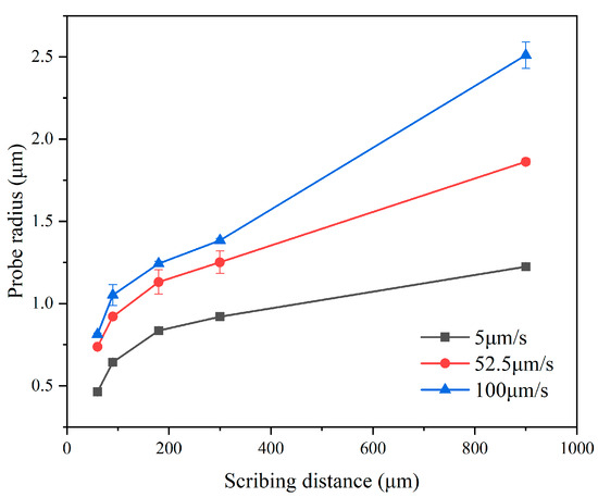 The experimental data in Figure 9 show that the probe radius increases significantly with increasing scribing speed and distance. When the scribing speed reaches 200 μm/s, the probe radius reaches 2.021 μm, and nonlinear growth occurs at this time.