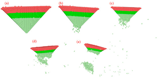 Simulation of diamond probe at different indentation depths. (a) H = 10 Å; (b) H = 15 Å; (c) H = 20 Å; (d) H = 25 Å; (e) H = 30 Å.