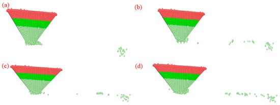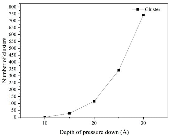 Thus, the process is interpreted as a physically realistic proxy for adhesion-driven material transfer, constrained by the potential’s parametric scope. The cluster changes of the simulation results under different indentation depths are shown in Figure 18.