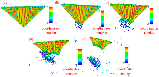 Coordination number analysis of diamond probes at different indentation depths. (a) H = 10 Å; (b) H = 15 Å; (c) H = 20 Å; (d) H = 25 Å; (e) H = 30 Å.