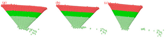 In the simulation model, the probe was made of diamond (carbon atoms). The diamond probe has a cubic structure and a lattice constant of 3.57 Å. The probe is conical (height: 50 Å, top diameter: 50 Å, tip diameter: effectively 0 Å) and contains 23,302 carbon atoms. The parameter table is shown in Table 3. The diamond probe was not treated as a rigid body. Its atomic region is split into three layers: a boundary layer, a thermostat layer maintained at 298 K, and a Newtonian layer. The Newtonian layer is the main computational region where wear occurs. The MD model is shown in Figure 4.