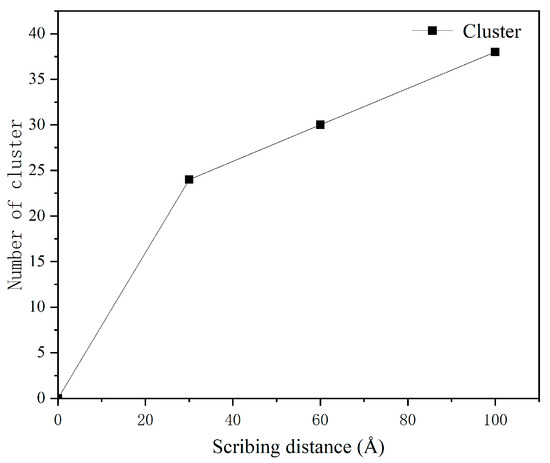 Cluster analysis was performed at an indentation depth of 15 Å and a scribing speed of 100 m/s for scribing distances of 30 Å, 60 Å, and 100 Å. At a scribing distance of 30 Å, 24 clusters were produced; at 60 Å, 30 clusters; and at 100 Å, 38 clusters. This increase indicates that prolonged sliding promotes cumulative atomic detachment, consistent with the progression of adhesive wear observed in the simulations. The variation of the cluster number with scribing distance is shown in Figure 25.