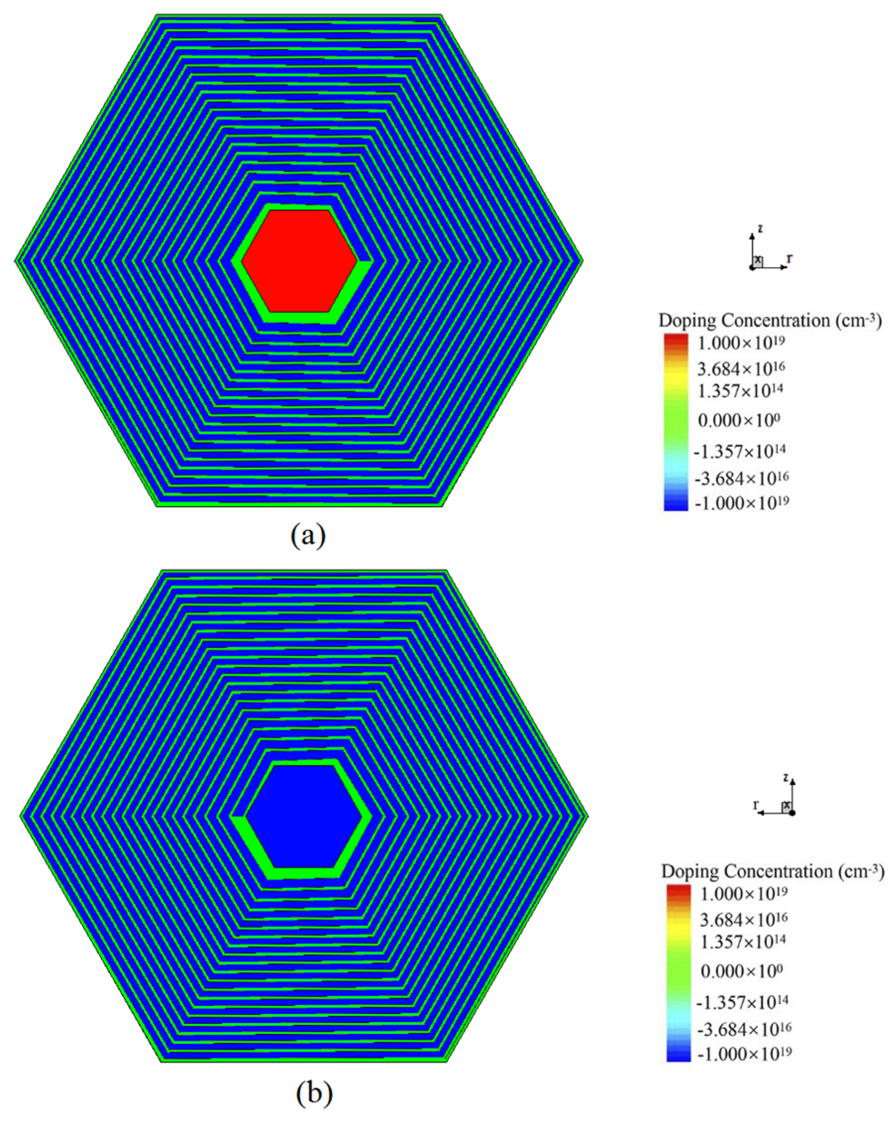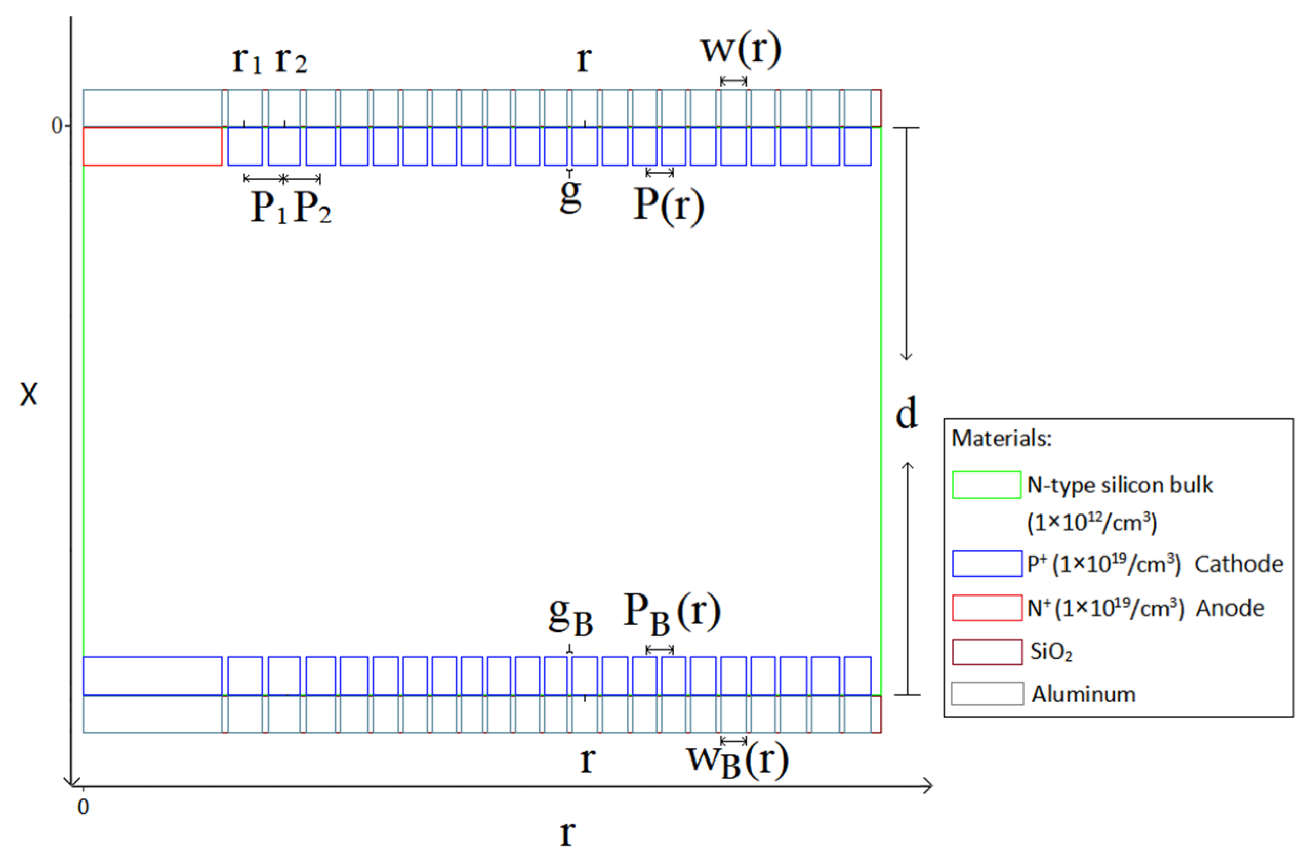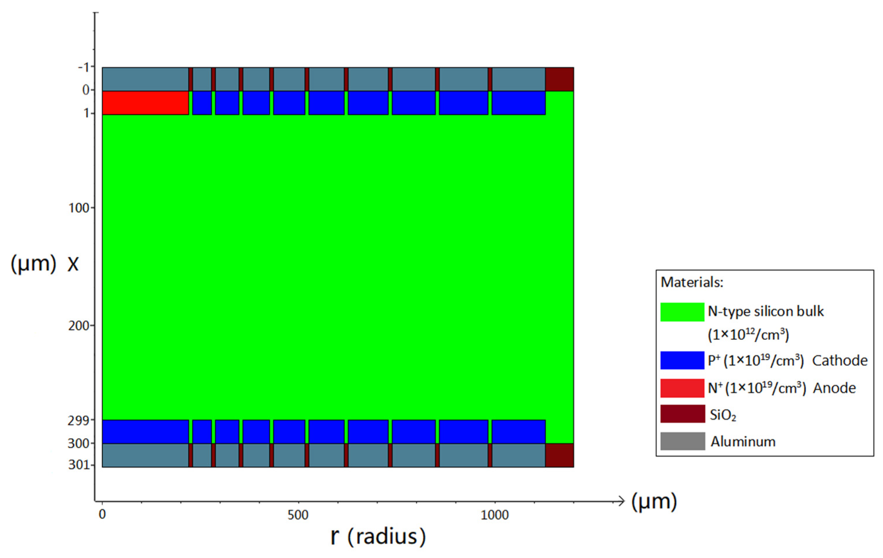 In our novel design method, the cathode gaps (g) under SiO2 are kept constant to minimize surface leakage current. We allow the pitch profile P r   to vary in an arbitrary way to obtain the optimum electric field distribution. Our design is different from that in [22], where a constant electric surface field is imposed. Although cathode gaps were kept constant in both cases, our electric field is allowed to change to obtain the optimal profile. Exact solutions of SDD of spiral design r = r θ can be obtained for the hexagonal spiral SDD. Based on the theoretically calculated coordinates of each point on the spiral ring, the SDD structure diagram can be drawn. Technology Computer-Aided Design (TCAD) is used for simulation in this work. We have systematically researched its respective electrical properties, such as the electric field and potential distributions, and the electron concentration distribution.