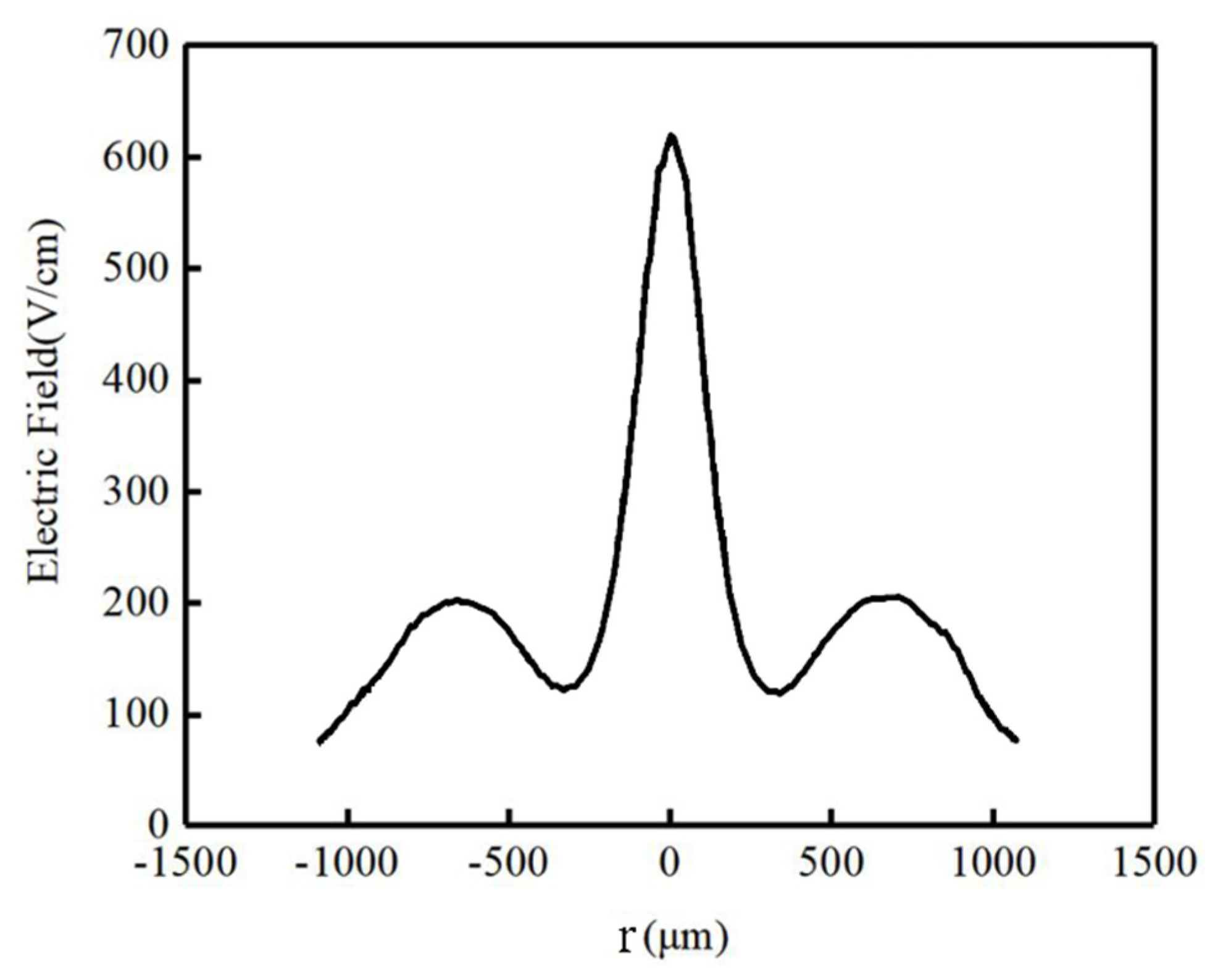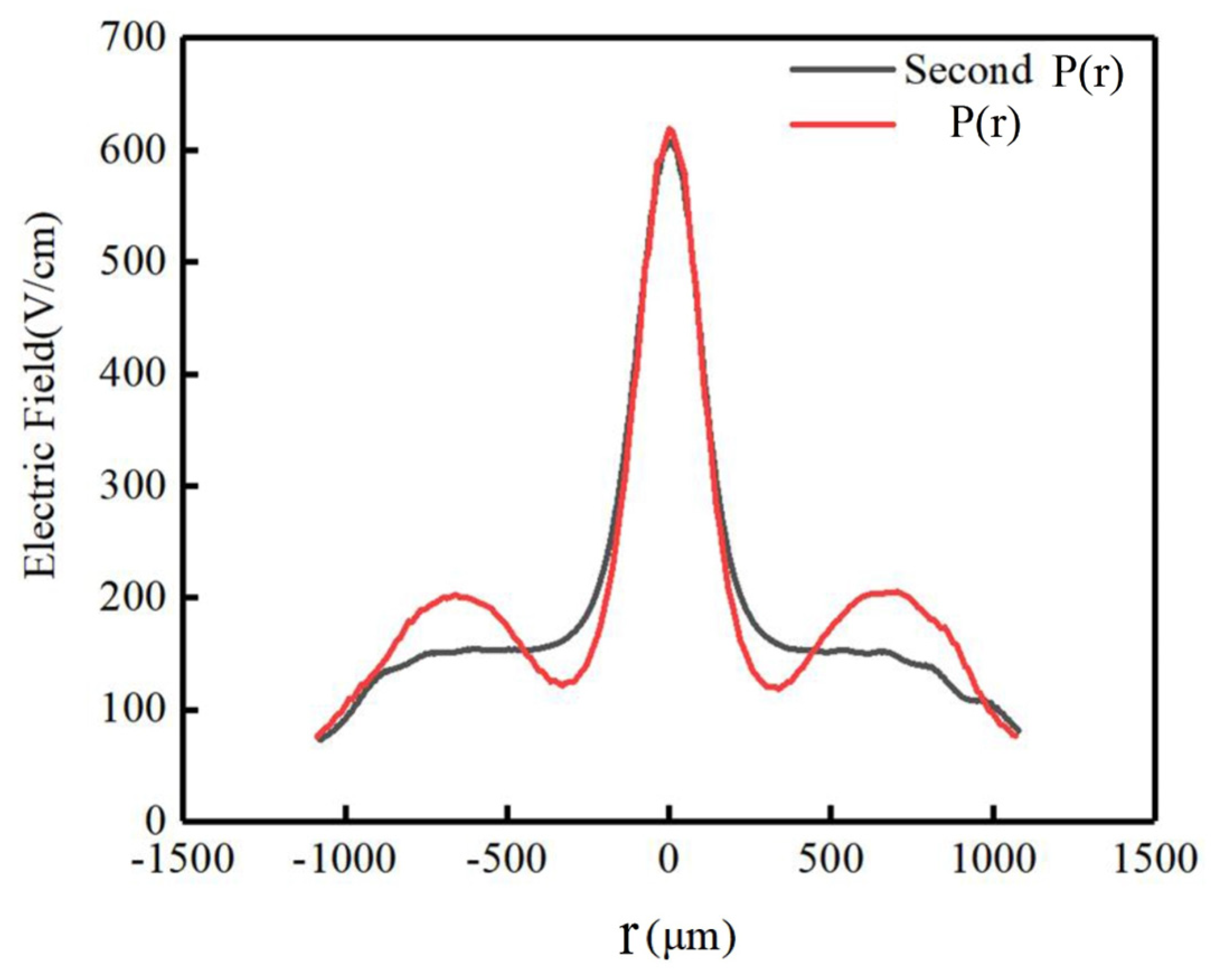 To compare the uniformity of the electric field distribution of the P(r) and the second P(r) detectors, Figure 13 shows a one-dimensional curve comparison of the electric field distribution at X = 160 μm, with the red curve representing the electric field distribution of the P(r) detector and the black curve representing the electric field distribution of the second P(r) detector. It can be clearly observed that the electric field intensity distribution of the second P(r) detector is symmetrical about the anode, there is a peak in the electric field distribution curve, and the magnitude of the electric field decreases with the increase in detector radius, and the curve is smooth. The electric field intensity distribution of the P(r) detector has three peaks including the anode area, and the electric field variation trend is unstable with fluctuations. Thus, it is verified that the electric field distribution of the second P(r) detector is more uniform and has better electrical performance than that of the P(r) detector.