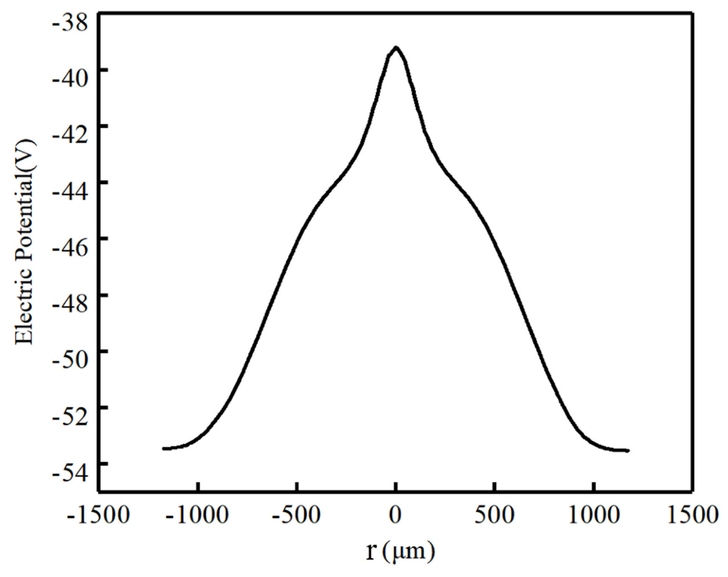 To highlight the difference in potential distribution between the P(r) and the second P(r) detectors, the potential distribution of the detector was cut at X = 160 μm to obtain the one-dimensional curve of potential with radius as shown in Figure 15. It can be clearly observed that the potential is highest at the anode and gradually decreases from the middle to both ends. The potential distribution curve of the second P(r) detector is smoother than that of the P(r) detector, meaning that the potential distribution of the second P(r) detector is more uniform.
