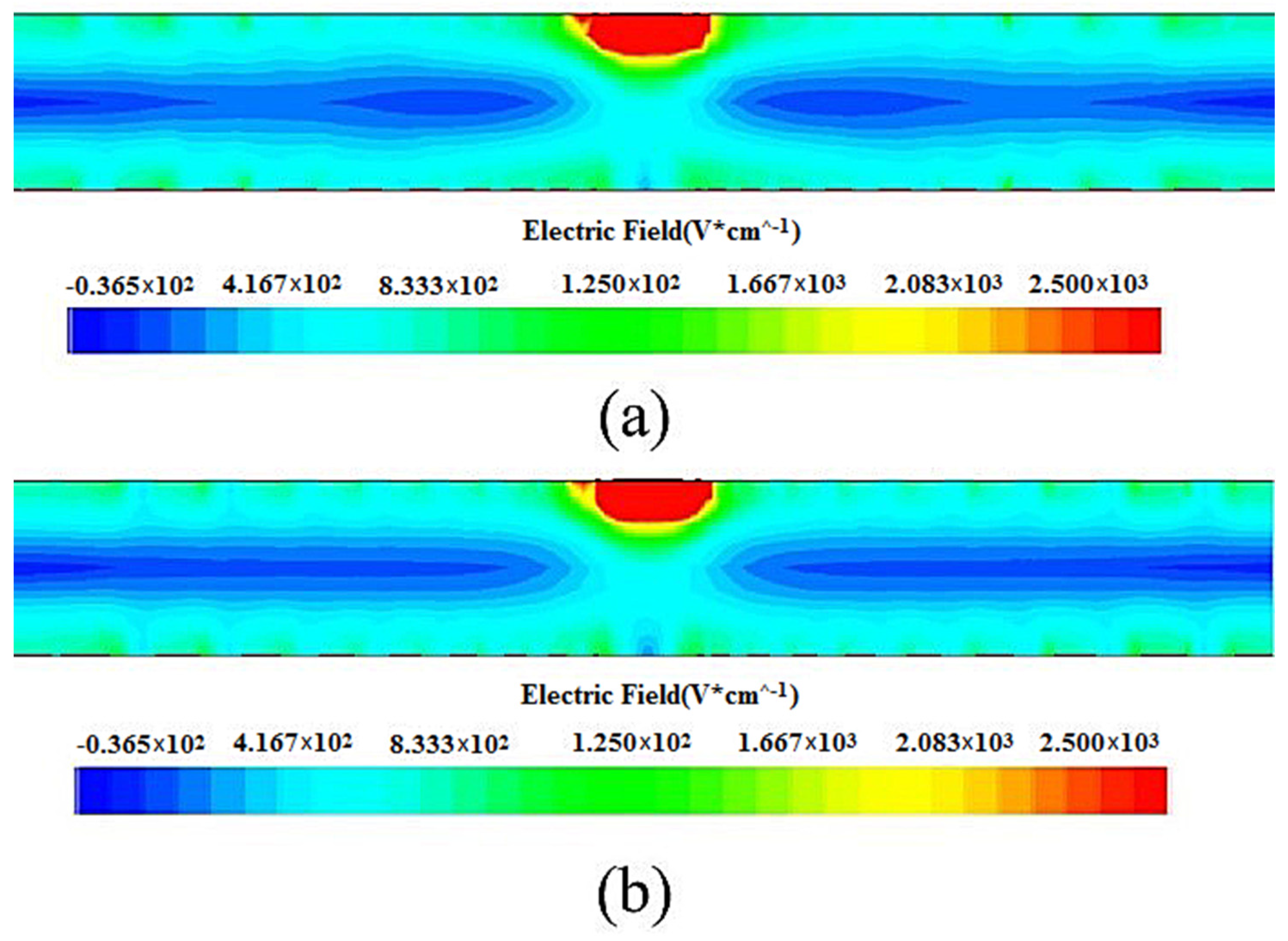 Figure 12. The electric field distribution diagrams of the spiral SDDs: (a) the P(r), (b) the second P(r).