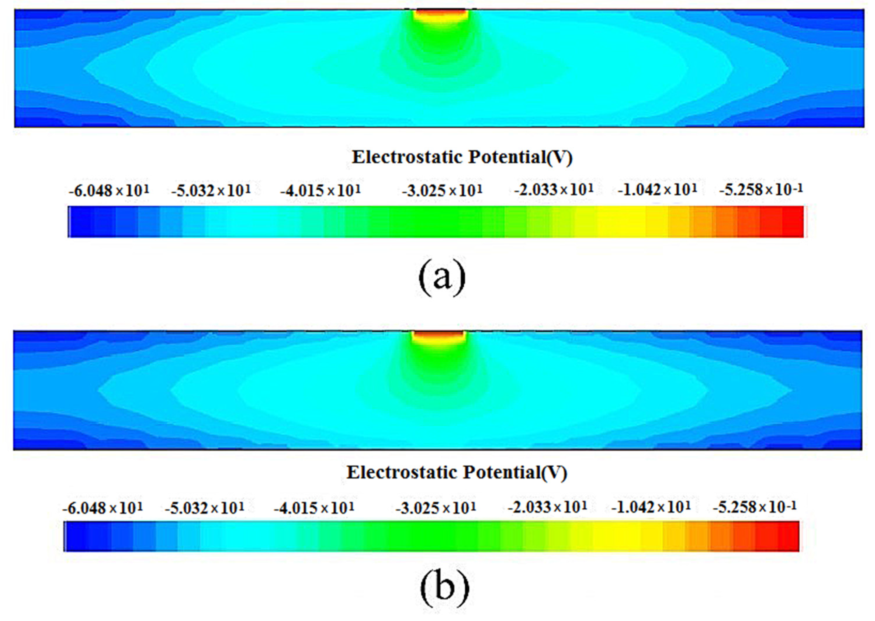 Figure 14. The two-dimensional cross-section potential distribution of the spiral SDDs: (a) the P(r), (b) the second P(r).