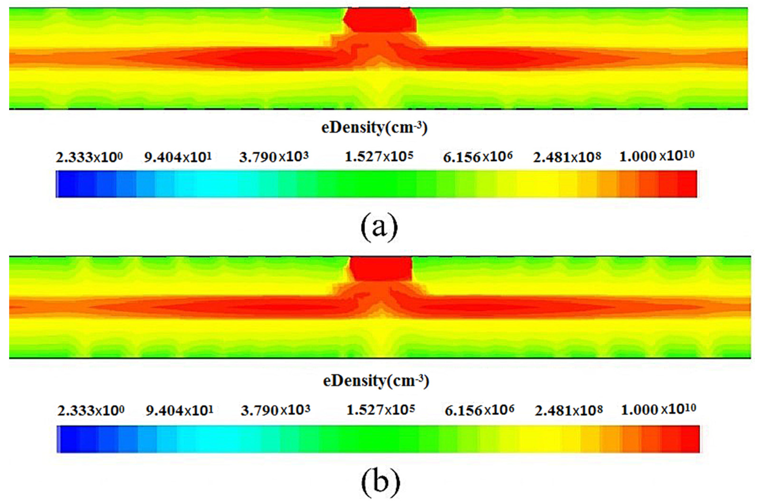 Figure 16 respectively shows the electron concentration distribution of the P(r) and the second P(r) structures of the spiral SDDs in the fully exhausted state, with the highest electron concentration in the collected anode region and a high electron concentration channel (the red area in the figure) generated in the middle region inside the detector, which is consistent with the drift channel generated in the electric field distribution. A comparison of the electron concentration distribution of the P(r) and the second P(r) detectors shown in Figure 16a,b reveals that the second P(r) detector has a more uniform electron concentration distribution, indicating superior electrical performance of the detector.