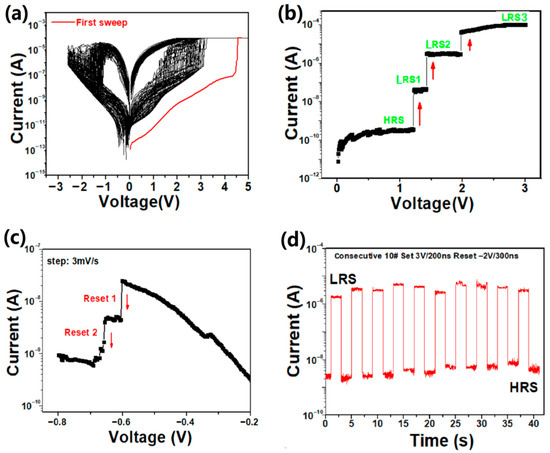 Progress in artificial intelligence and data-centric computing is creating a need for the exploration and pursuit of high-efficiency parallel computing methods and high-density storage equipment [1,2]. Resistive random-access memory (RRAM), one of the most promising forms of next-generation nonvolatile memory, has been extensively studied for in-memory and neuromorphic computing recently due to its small physical size, high speed, low power consumption, multistate programmability and compatibility with the standard complementary metal oxide semiconductor (CMOS) process [3,4,5,6,7]. To meet the demands of the Big Data era for massive data storage, researchers have employed various methods to increase the storage density of RRAM. Historically, scaling down of device dimensions as well as three-dimensional (3D) crossbar architectures has been employed to achieve greater storage density in RRAM. However, the complexity of the required fabrication processes hinders its practical implementation [8,9]. In comparison to the two methods, multilevel cell (MLC) technology provides a much simpler alternative for enhancing RRAM storage density. It achieves this by allowing multiple bits to be stored in a single cell, thereby eliminating the requirement to shrink the physical device. So, MLC functionality is a key advantage of RRAM, offering a promising pathway to significantly enhance memory storage density [10,11,12,13,14,15]. Numerous studies have reported methods for achieving multilevel storage capabilities in RRAM, typically by modulating the compliance current or reset voltage to attain controllable multilevel states in the devices [12,15,16]. This is because the resistance variability in RRAM primarily correlates with the dimensions or numbers of the formed conductive filaments (CFs) within devices, which can be obtained by adjusting the compliance current or the reset voltage [6,10].
