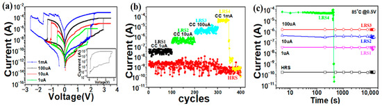 Figure 3a presents the bipolar RS behaviors of the Cu/a-SiC/P+-Si memory device by setting different Icomp values. Through setting different Icomp values of 1 µA, 10 µA, 100 µA and 1 mA during the DC voltage sweep, the Cu/a-SiC/P+-Si device could be set to four different LRSs. It is worth pointing out that the Cu/a-SiC/P+-Si device still exhibited bipolar resistive switching characteristics when the compliance current was increased to 1 mA. However, the device was found to frequently fail to stay in the low-resistance state under a compliance current of 1 mA, as illustrated in the inset of Figure 3a. The distributions of the HRS resistance and four different LRS resistances (LRS1, 2, 3, 4) of the Cu/a-SiC/P+-Si device during 100# successive dc switching cycles are shown in Figure 3b, and the value of each resistance state was measured at a 0.5 V reading voltage. It can be found that the resistance states switched from HRS to LRS1, then from LRS1 to LRS2, and finally from LRS2 to LRS3, and each LRS resistance ratio was about 10 times. Although the device could successfully switch from LRS3 to LRS4 when the current compliance increased from 100 µA to 1 mA, it is evident that LRS4 automatically returned to the HRS after fewer than 50 cycles due to its inability to maintain the low-resistance state. Furthermore, determination of the data retention of the multilevel resistance states was performed at 85 °C and read at 0.5 V, as shown in Figure 3c. It can be seen that the HRS and the LRS1~LRS3 show good retention without obvious degradation while the device exhibits degraded retention performance at a compliance current of 1 mA. We can see that the LRS4 abruptly fails and reverts to the HRS at approximately 400 s. This phenomenon is likely attributable to two concurrent factors: the increasing number and the thickening of the conductive filaments (CFs) within the device as the compliance current rises, both of which contribute to a further reduction in resistance. According to Guo et al. [22], the filament temperature increases when a higher current passes through these low-resistance copper CFs, accelerating the migration of copper atoms within the filaments. The enhanced atomic migration promotes filament rupture, consequently causing the device to revert from the LRS to HRS spontaneously.