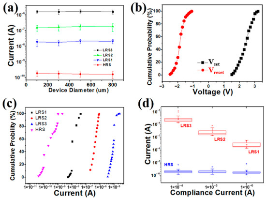 Several Cu/a-SiC/P+-Si devices were fabricated with the electrode diameter ranging from 100, 300, and 500 to 800 µm. We randomly selected ten devices including all of the four sizes to study the I–V behaviors as well as device-to-device uniformity (50 cycles for each device). As shown in Figure 4a, it is clear that both HRS and LRS currents exhibit small current variations as the electrode size increases from 100 to 800 µm, suggesting a local conductive filament. Figure 4b,c show the statistical distributions of the Set/Reset voltage and the currents on four resistance states across device to device, respectively. The Set/Reset voltage and the current on LRS/HRS values were read at 0.5 V in each dc sweep. As is seen, the Vset/Vreset range of the Cu/a-SiC/P+-Si was 1.5~3.2 V/−1.2~−2.5 V, which indicates a relatively narrow distribution of both Set and Reset voltages. The current on LRS1 varies from 10−9 to 10−8 A; the current on LRS2 is confined to 10−7 A; and the majority of the current on LRS3 values are of the order of 10−6, with only a very few fluctuating around 10−5. The current on the HRS fluctuates between 10−11 and 10−10 A. Apparently, the four resistances show good stability with a satisfactory ON/OFF ratio (~10 times) between one another. The device-to-device coefficients of variation (standard deviations/mean value) for Vset, VReset, LRS1, LRS2, LRS3 and HRS are calculated to be 0.41, 0.28, 0.47, 0.38, 0.34, 0.43, respectively. The cumulative probability results show acceptable distribution, indicating the good device-to-device uniformity. Figure 4d is the box plot which shows cycle-to-cycle variation for the current on the four resistance levels (100 cycles for a memory). It can be observed that the Cu/a-SiC/P+-Si memory shows clear multilevel switching with distinct regions for each level, indicating the great potential for Cu/a-SiC/P+-Si memory to be used for multilevel switching.