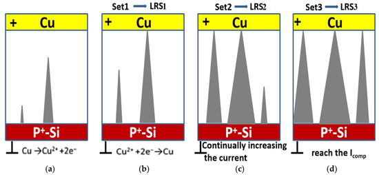 When more and more Cu2+ is reduced to copper atoms at several locations at the bottom electrode, the corresponding cone-shaped copper accumulations of varying height are likely to form randomly within the device, as shown in Figure 5a. These randomly generated copper atom stacks of different heights and sizes will, to a certain extent, change the electric field distribution inside the thin film. According to Liu’s work [26], the strongest electrical field appears at the tip of the highest precipitate. Therefore, driven by the electric field, most Cu ions accumulate at the highest precipitate which results in its fastest growth rate and the first conductive filament connecting the top and bottom electrodes, thereby switching the device from HRS to LRS1, as shown in Figure 5b. As the current further increases, the primary conductive filament (CF) thickens and the other copper atomic accumulations, initially non-bridging, also experience rapid growth, quickly leading to the formation of a second, third, and ultimately more conductive filaments that connect the top and bottom electrodes, which enables the device resistance to be set to LRS2, as shown in Figure 5c. The progression continues until the compliance current is reached, at which point the device transitions to its final LRS3, seen in Figure 5d, and the formation of multiple conductive filaments ultimately leads to the realization of multilevel storage.