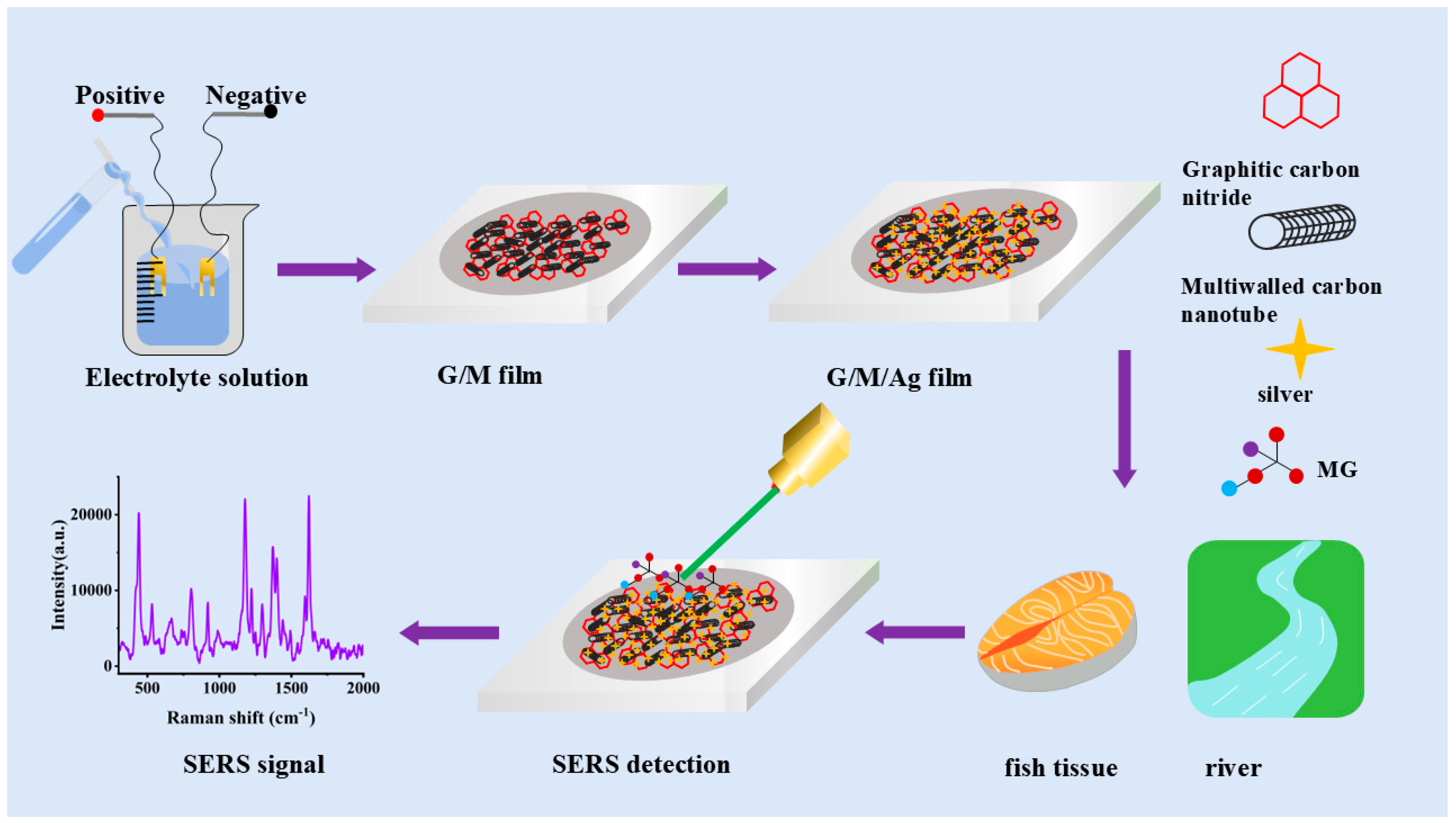 - Chen, G.; Mi, F.; Zhang, S.; Rao, X.; Sun, J.; Yang, Z.; Guan, M. Magnetic Nanoporous Carbon-Based Self-Enriched and Self-Cleaning Recyclable Substrate Co/C@Ag/g-C3N4 for SERS Detection and Photocatalytic Degradation of Malachite Green. Food Chem. 2025, 493, 145723. [Google Scholar] [CrossRef] [PubMed]