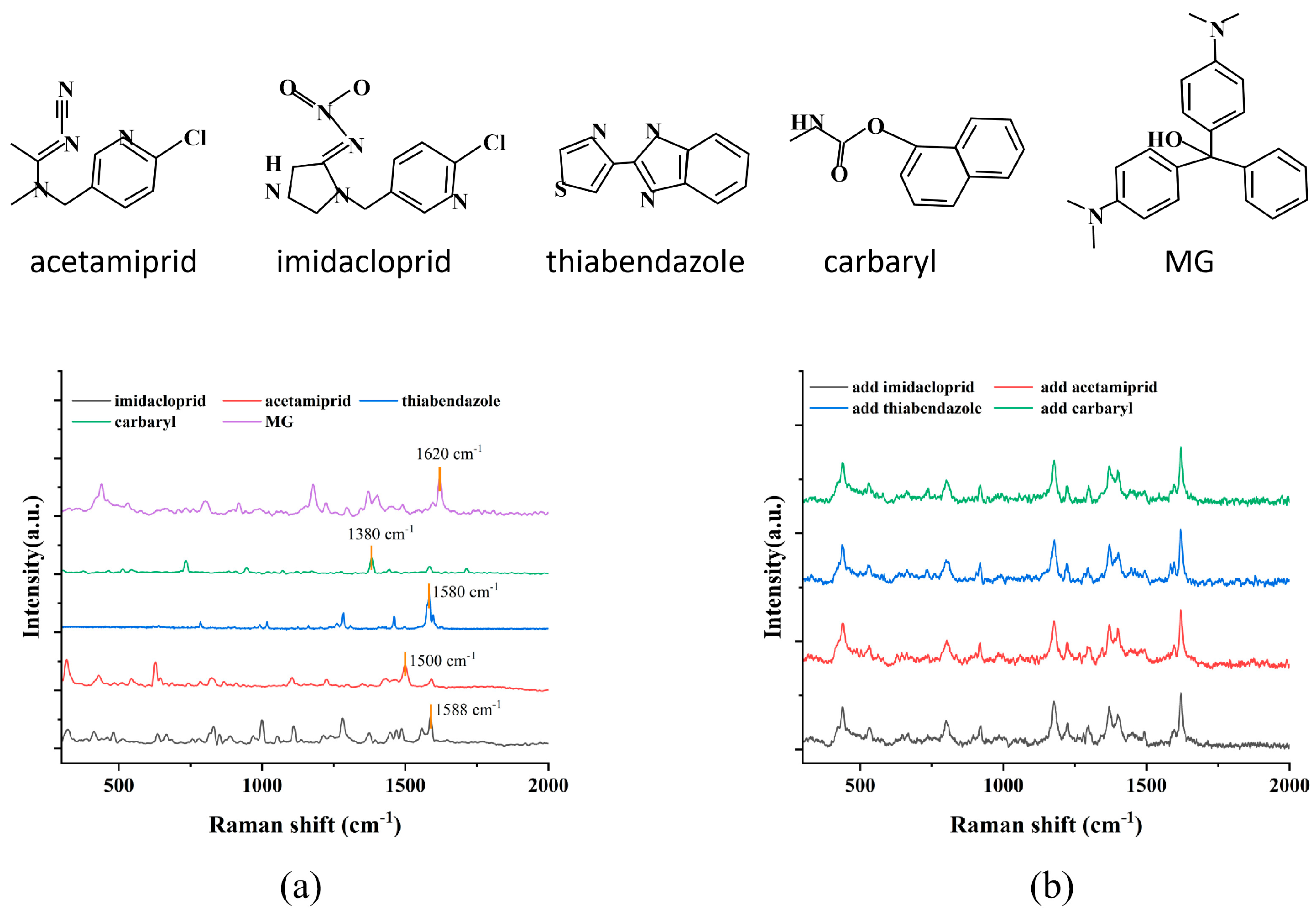 - Luo, H.; Huang, Y.; Lai, K.; Rasco, B.A.; Fan, Y. Surface-Enhanced Raman Spectroscopy Coupled with Gold Nanoparticles for Rapid Detection of Phosmet and Thiabendazole Residues in Apples. Food Control 2016, 68, 229–235. [Google Scholar] [CrossRef]