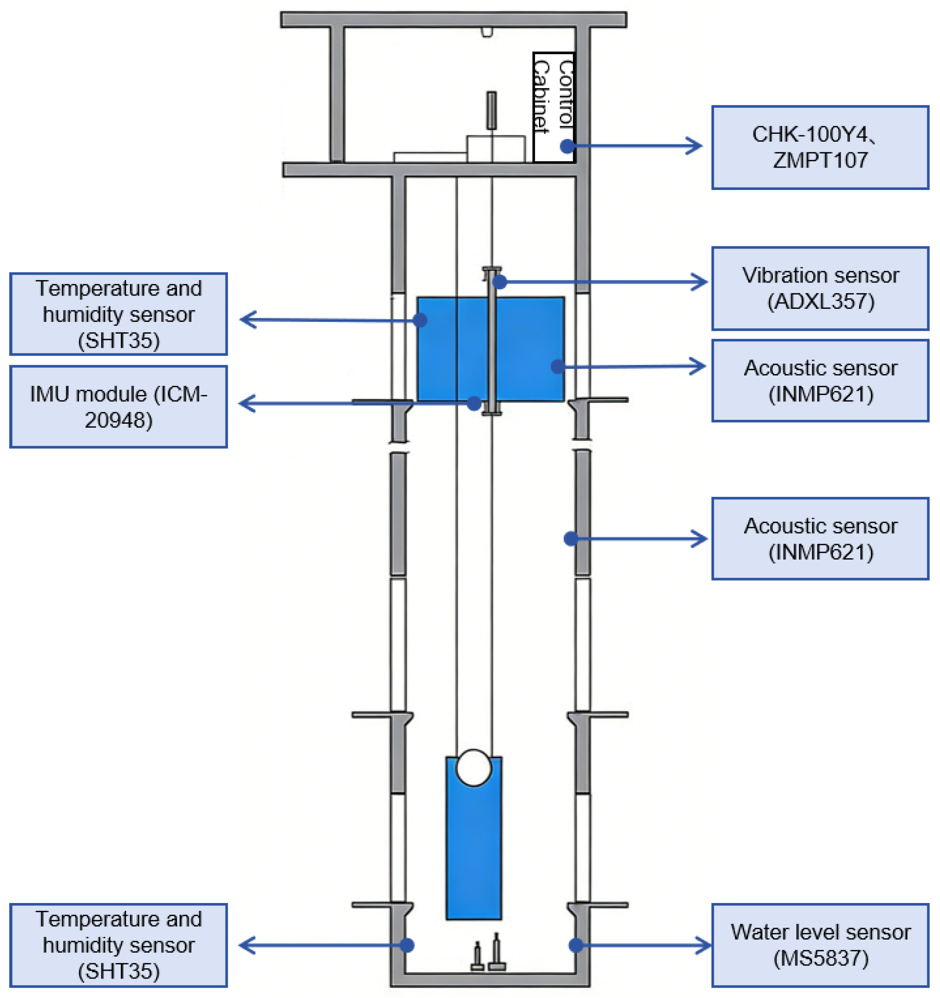 2; door system sticking is often accompanied by an abnormal sound pressure level increase exceeding 15 dB; electrical faults, such as motor inter-turn short circuits, manifest as a three-phase current unbalance exceeding 10%; inverter faults can be detected by a total voltage harmonic distortion rate exceeding 5%; the risk of pit water accumulation is monitored by a water level sensor with a threshold set at 50 mm; and environmental factors like pit humidity exceeding 85% trigger an environmental alert.