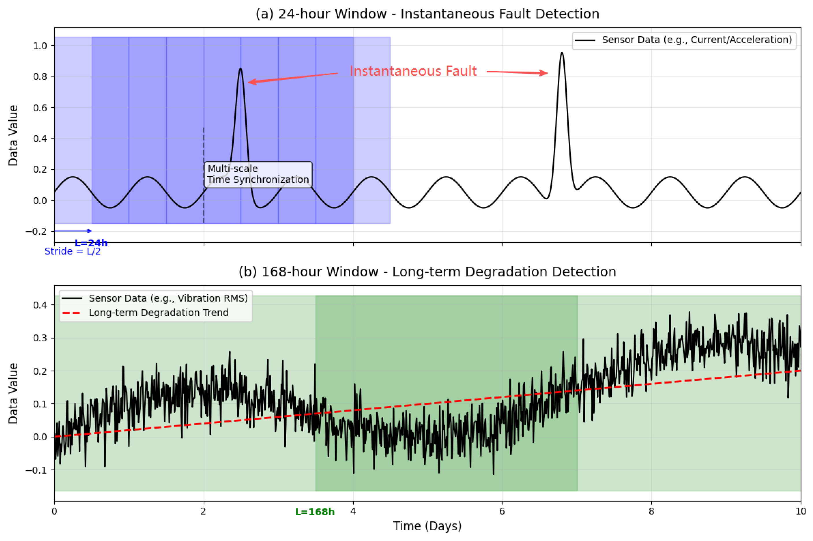 The multi-scale window strategy increases the F1 score by 1.5% over the single 24 h window. Analysis shows the 24 h window achieves higher detection accuracy for sudden faults, while the 168 h window provides stronger early warning for progressive degradation faults. Their fusion enables the system to capture both transient anomalies and long-term trends, achieving full coverage of fault types.